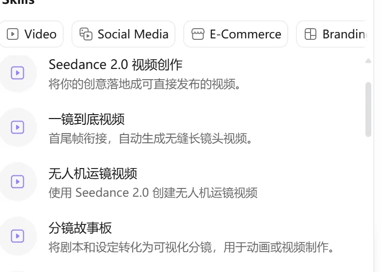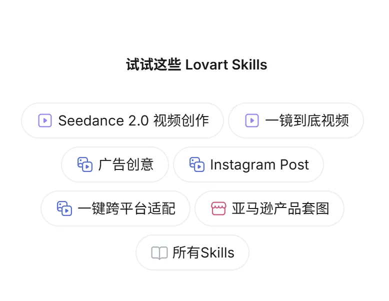 Skill(技能)是一个个可复用的专业模块。你可以理解成:把某个类型的创意工作封装成了一个技能包。小红书封面生成器、电商主图优化师、活动促销文案写作,每个 Skill 拿出来就能独立跑,不需要每次重新调试。
