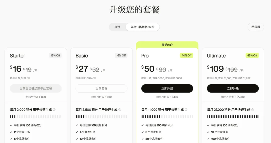 Pro:约50美元/月,约11000 Credits/月,适合专业设计师和团队。