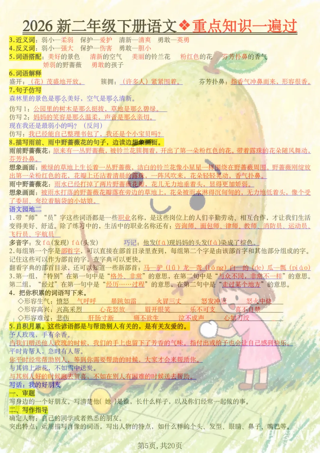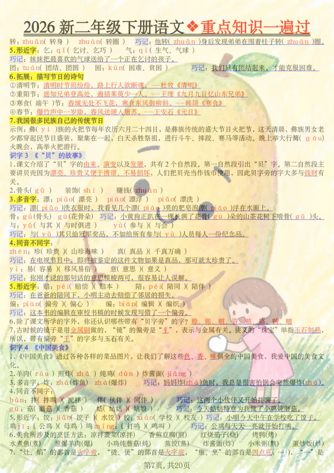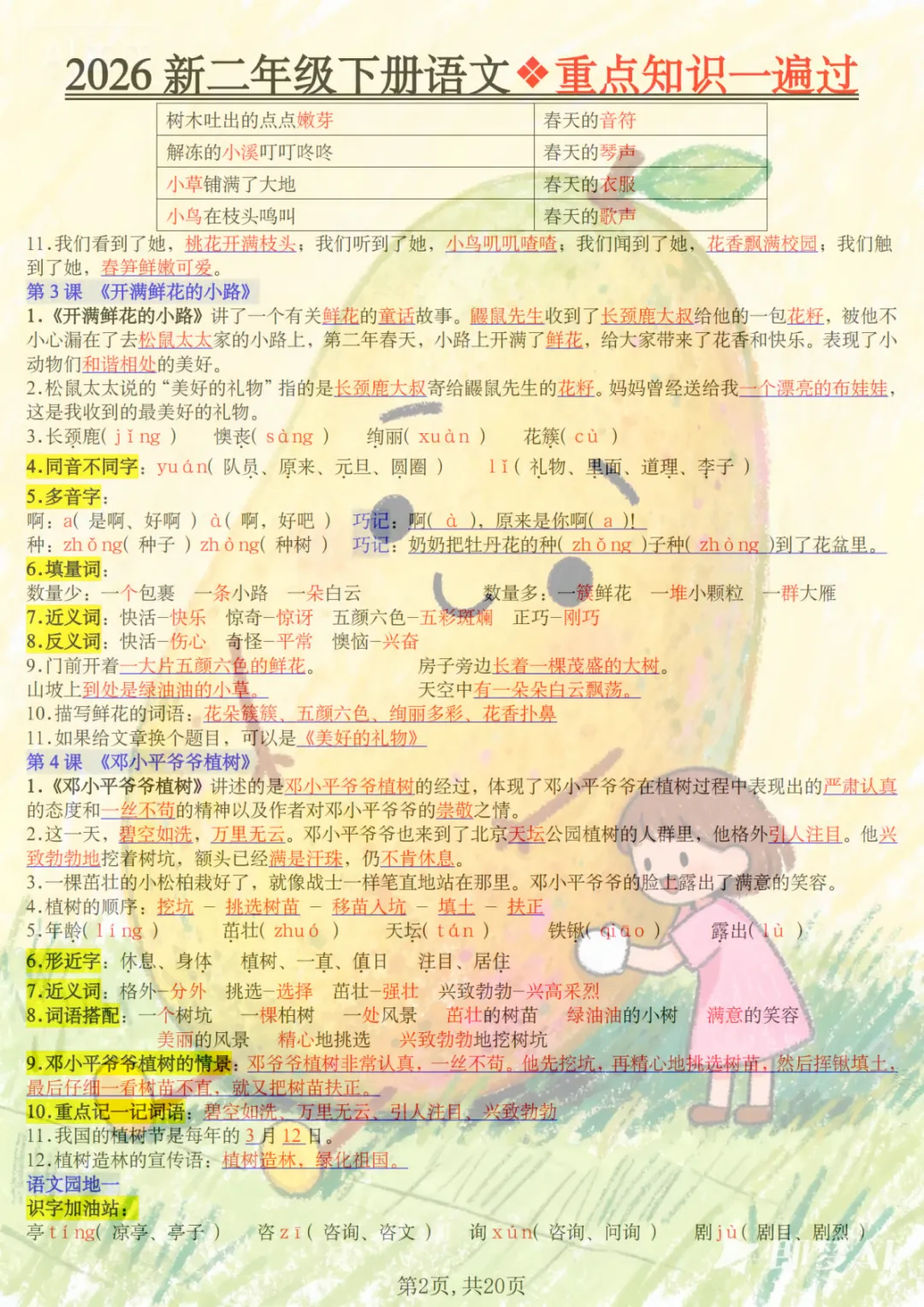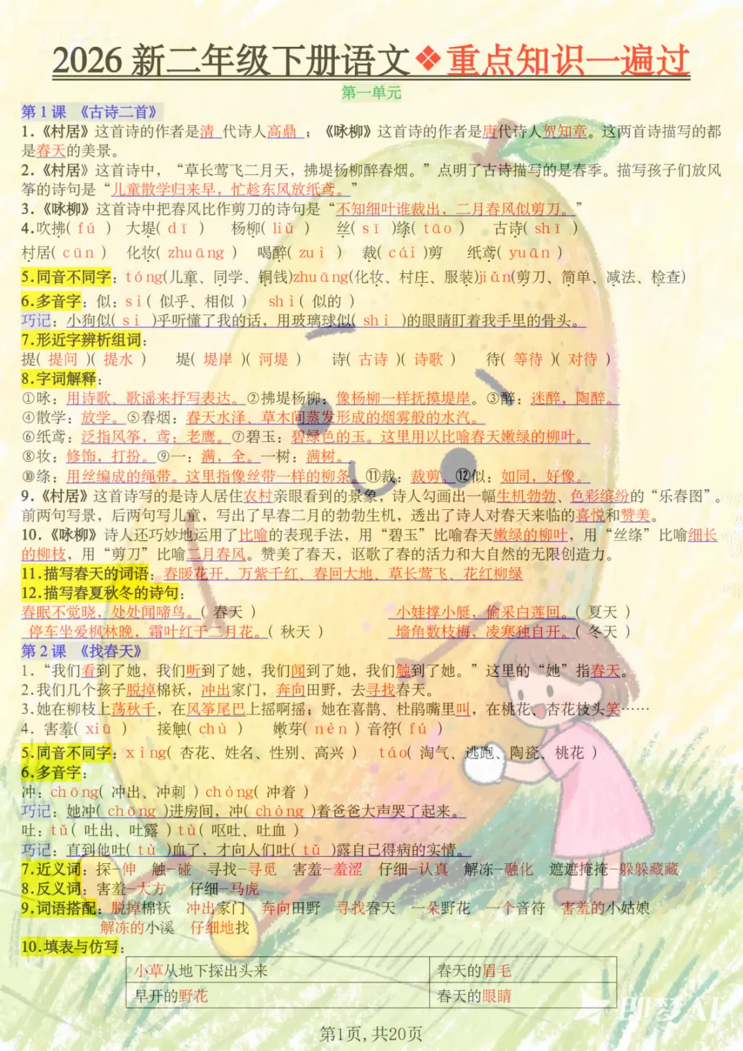 二年级下语文2026春重点知识一遍过,共20页,电子版可下载可打印,这份资料围绕二年级下册语文学习内容进行梳理与巩固,涵盖多个核心知识点与专项训练内容,适合孩子在课内学习后同步复习、查漏补缺,帮助孩子更系统地掌握重点、难点内容。需要的家长可以及时保存打印出来,让孩子练一练、过一遍。