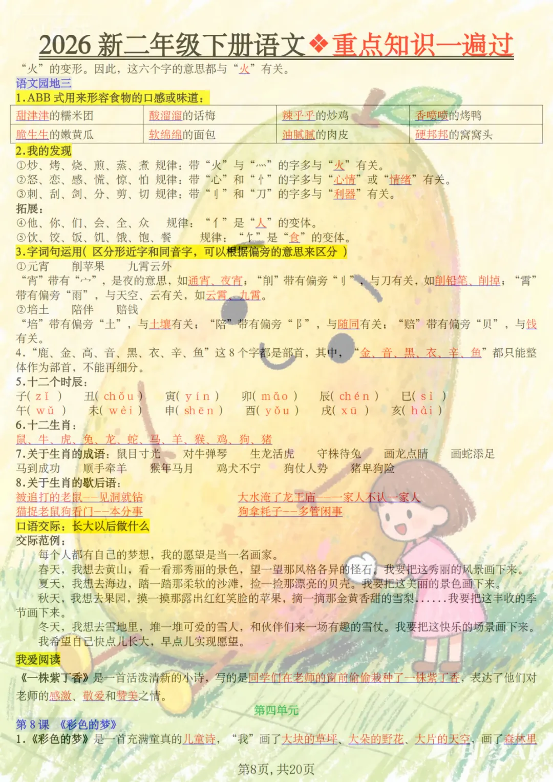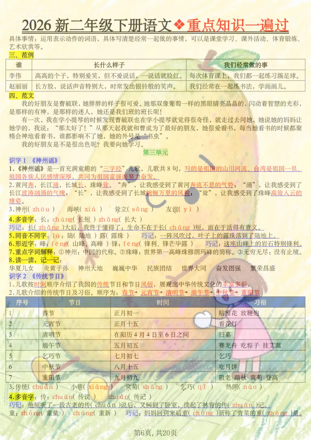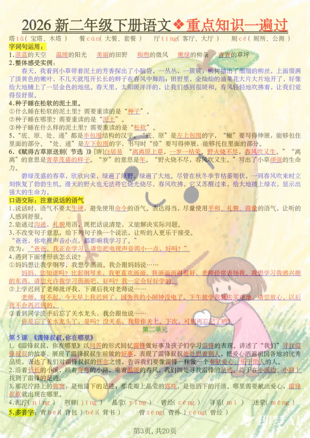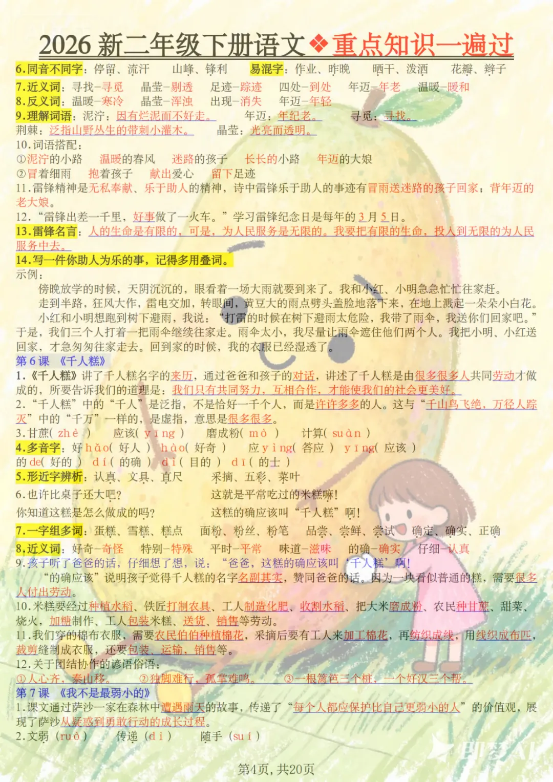 二年级下语文2026春重点知识一遍过,共20页,电子版可下载可打印,这份资料围绕二年级下册语文学习内容进行梳理与巩固,涵盖多个核心知识点与专项训练内容,适合孩子在课内学习后同步复习、查漏补缺,帮助孩子更系统地掌握重点、难点内容。需要的家长可以及时保存打印出来,让孩子练一练、过一遍。