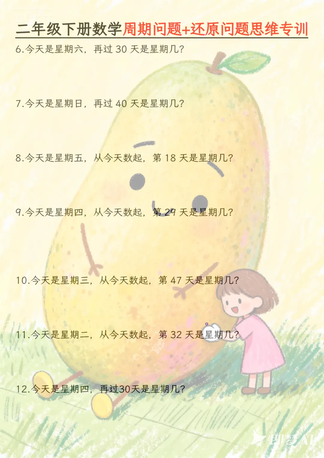 二年级下数学周期+还原问题两大重难点,共14页,电子版可下载可打印,这份专项练习题紧扣二年级下册数学中的两大重难点,围绕周期规律的观察与应用、还原问题的分析思路与解题训练展开,帮助孩子理清题意、掌握方法、提升举一反三的能力,适合课后巩固和阶段复习使用,需要的家长可以尽快打印出来,让孩子认真练一练。
