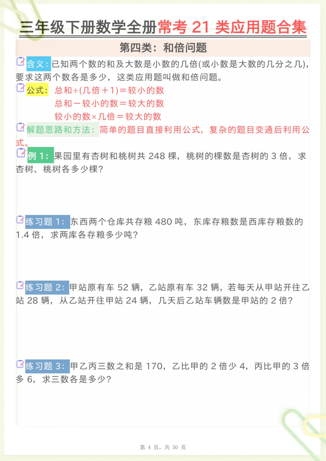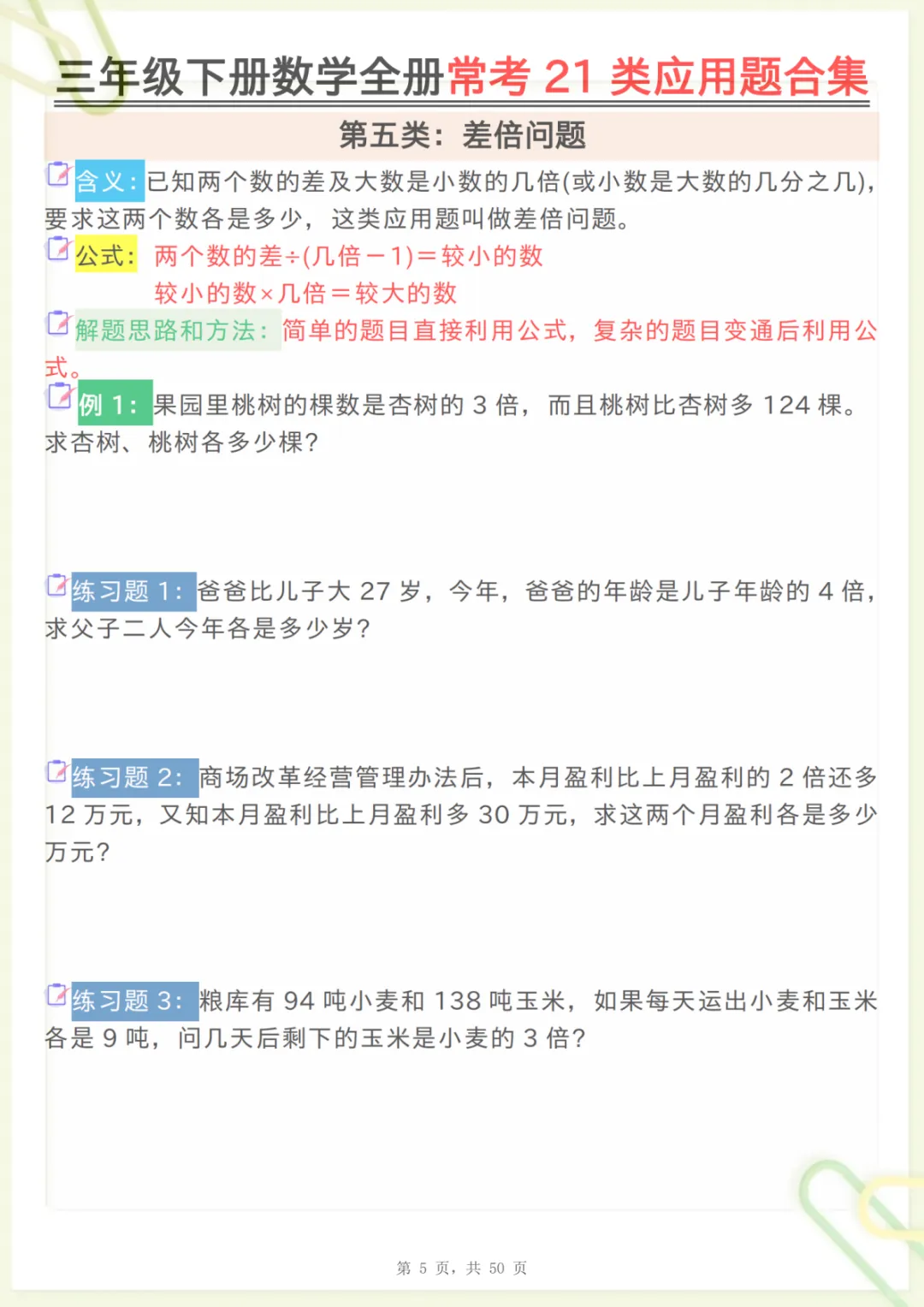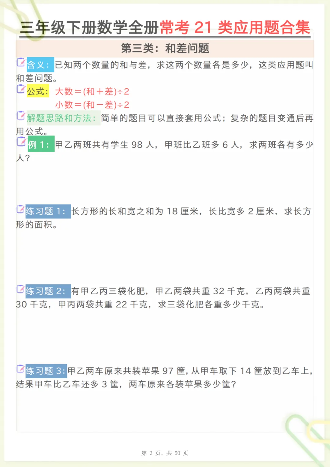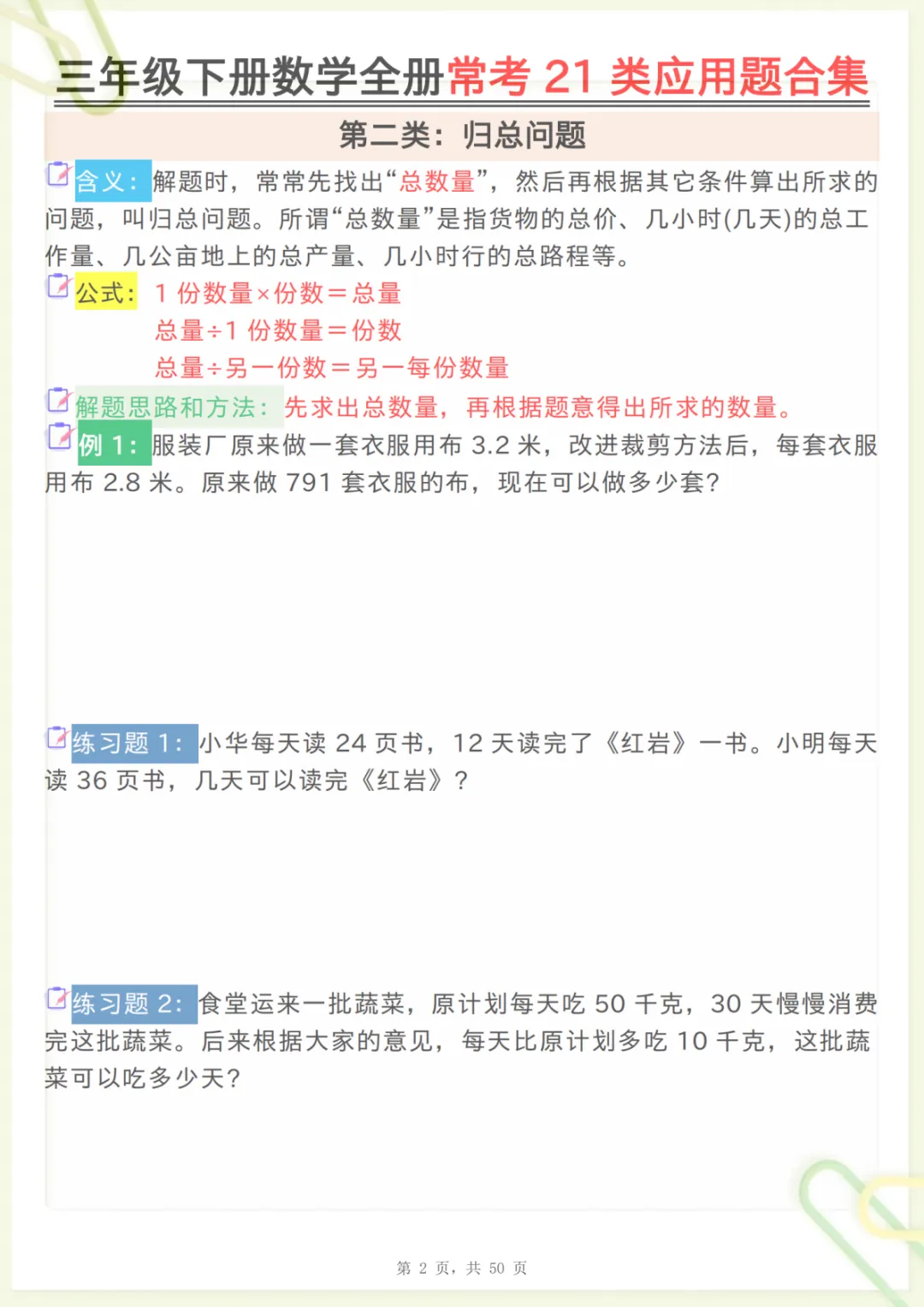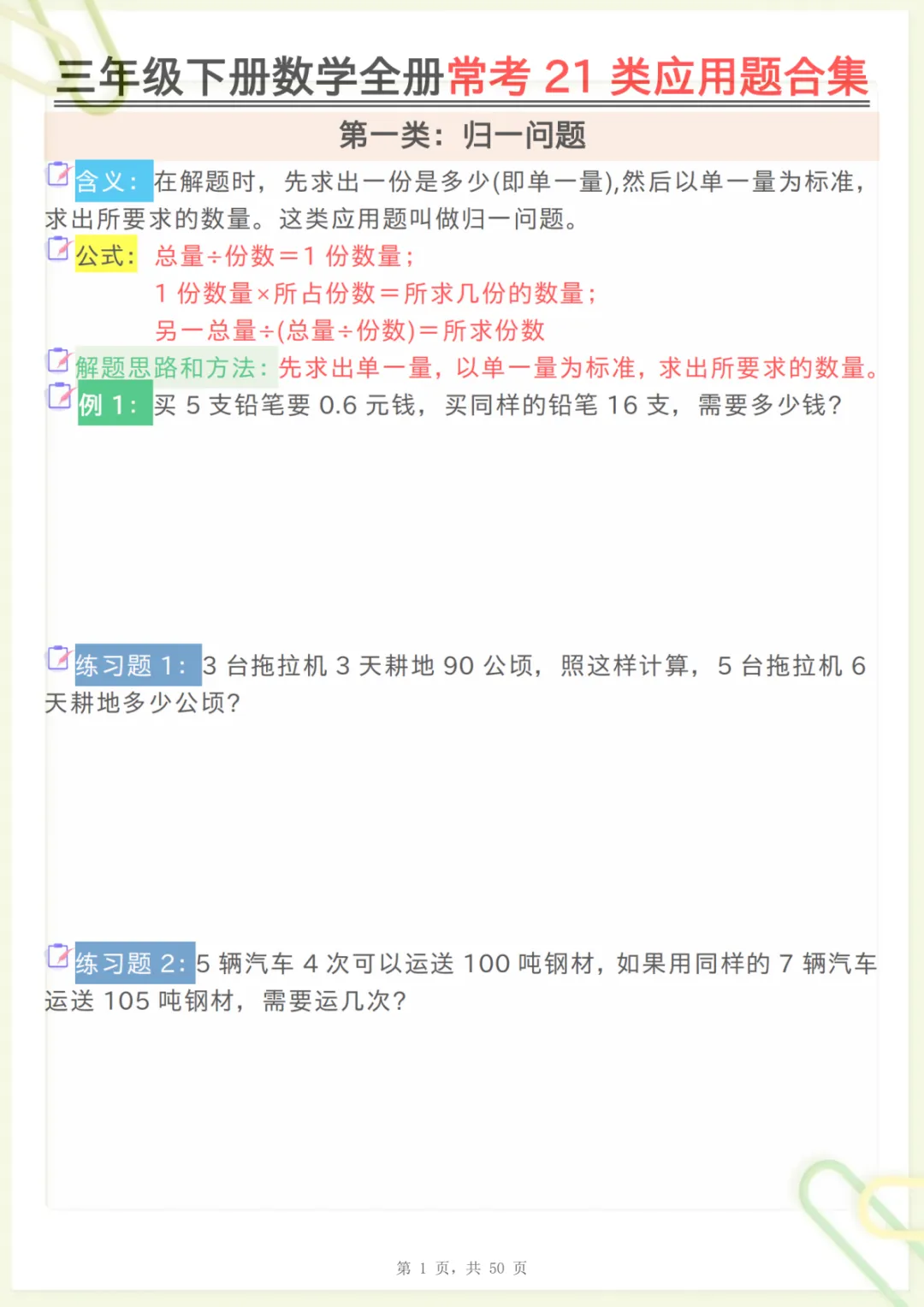 三年级下数学全册常考21类应用题合集,共50页,电子版可下载可打印,这份资料围绕三年级下册数学学习中的常见应用题类型进行系统整理,涵盖多个核心知识点与专项训练内容,帮助孩子更有针对性地练习审题、分析数量关系和解决实际问题的能力,适合作为日常巩固、阶段复习和查漏补缺使用。需要的家长可以抓紧下载打印出来,让孩子练一练,更扎实地掌握本册重点内容。