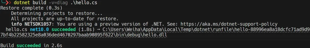 反编译看一下会是什么样的,通过 dotnet build -v=diag hello.cs 来输出详细的一些日志,可以看到编译之后的 dll 文件