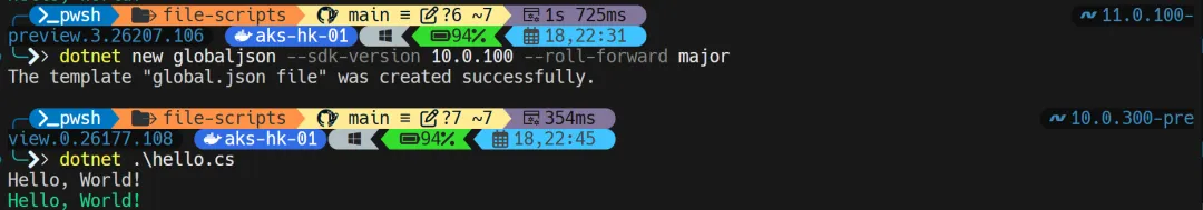 如下图所示,我添加了一个 global.json 来控制 SDK 的版本,可以看到后面执行的时候 SDK 版本已经从 .NET 11 preview 3 的版本变成了 10.0.300-preview 版本,但是也成功的打印出来的执行结果
