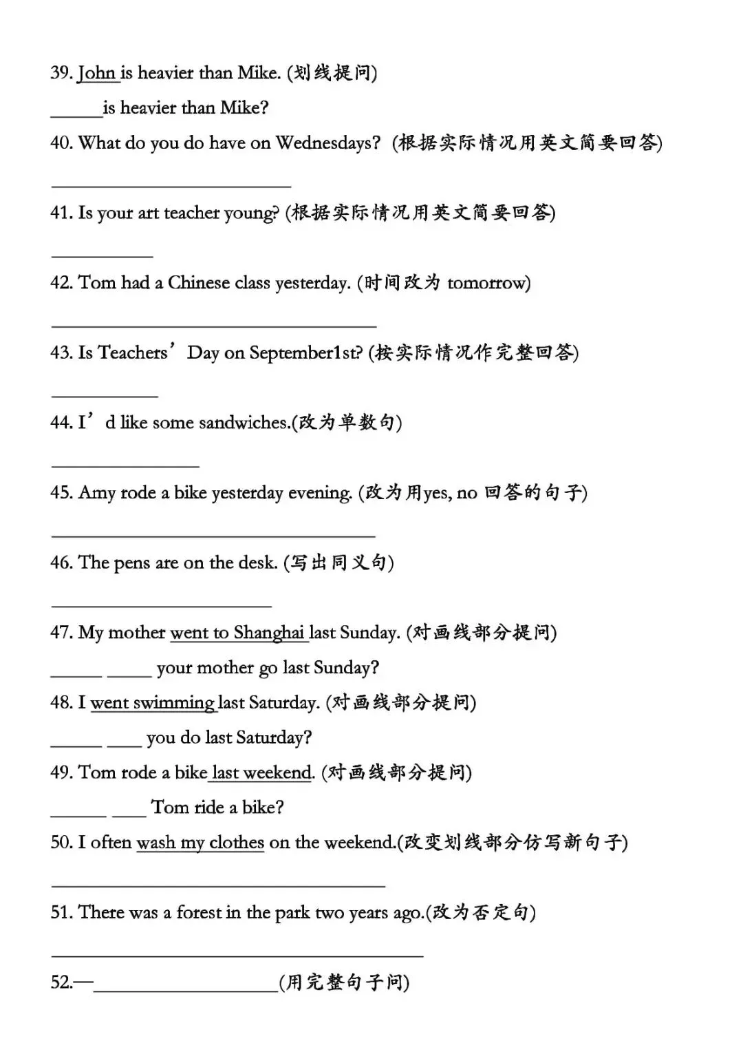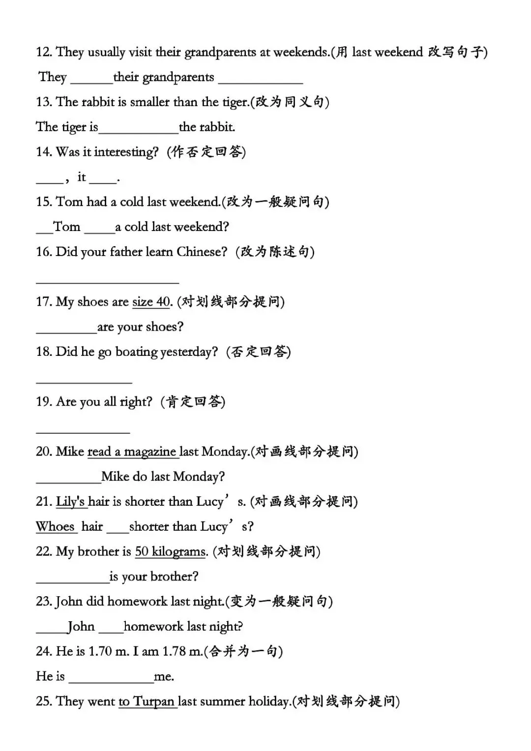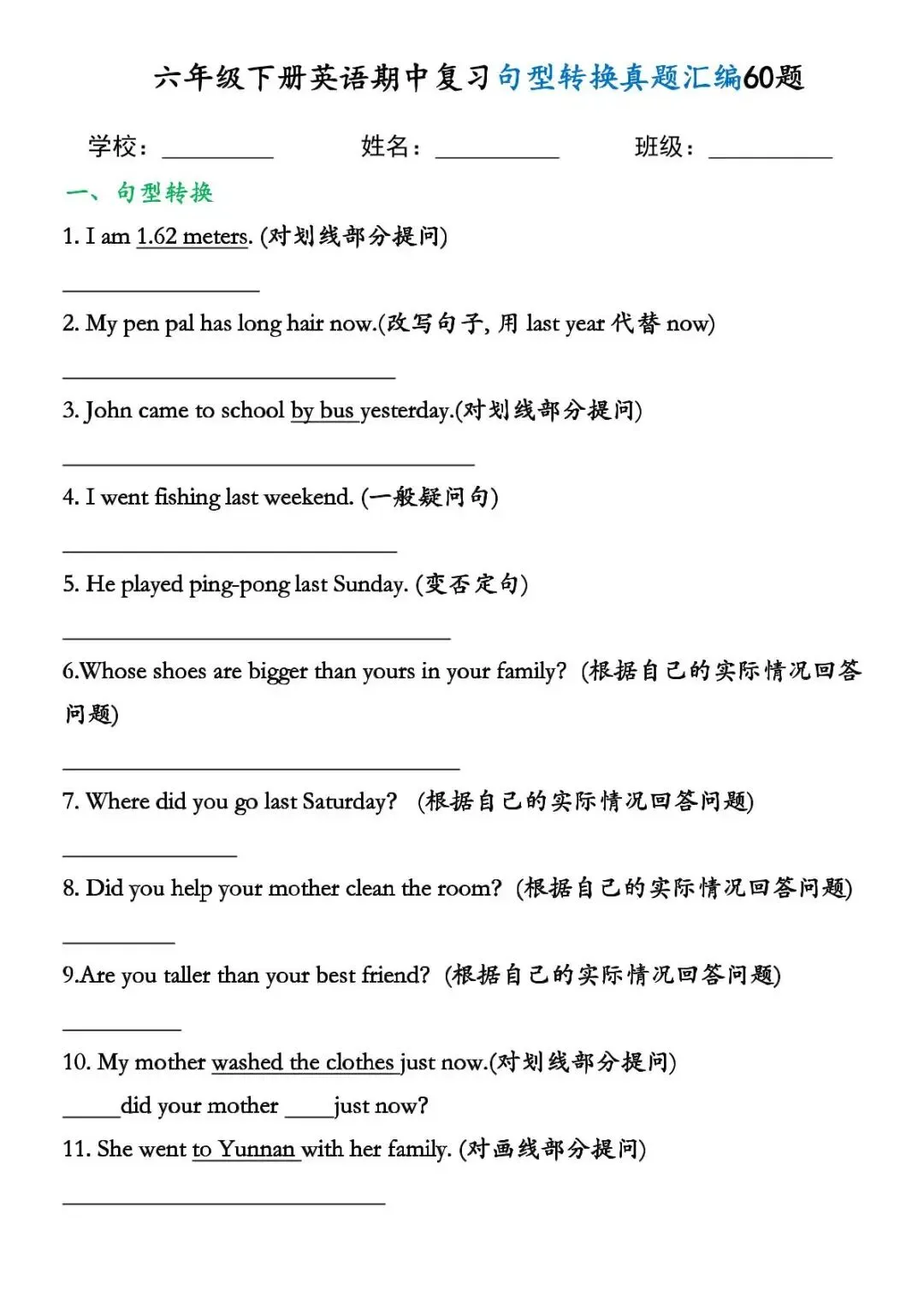 🌈今日分享26春通用版六年级下册英语《期中复习句型转换真题汇编60题》,共5页,电子版可打印。需要的家长抓紧打印出来,让孩子在每天练一练吧。