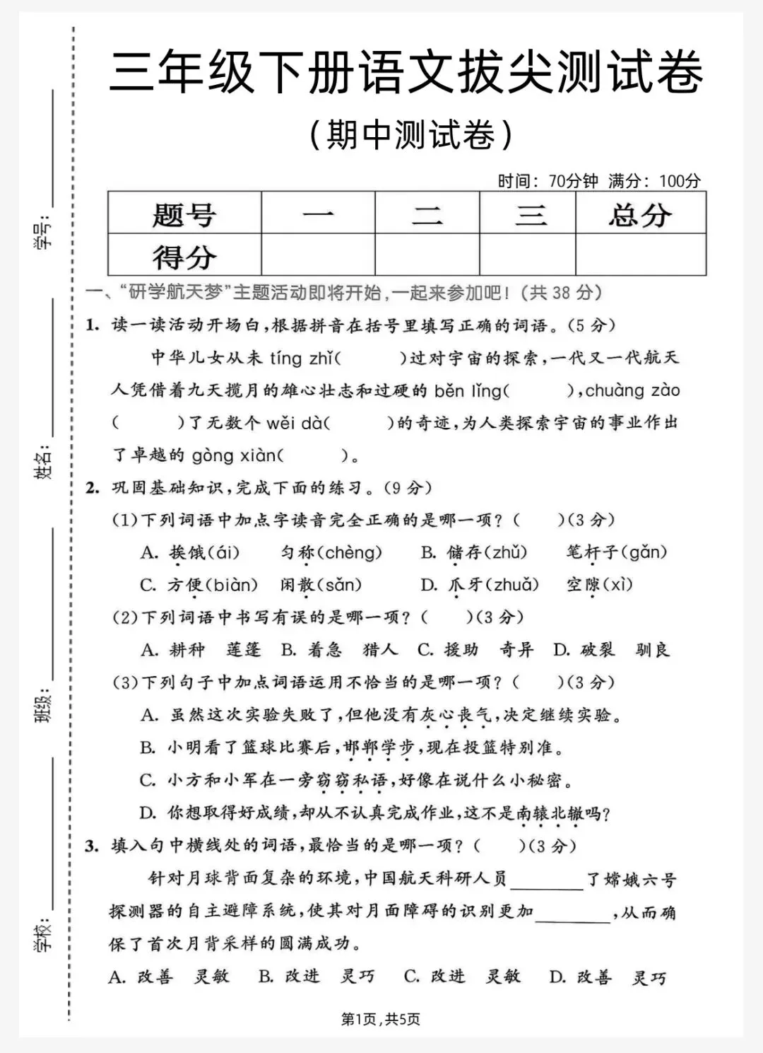 26春三年级下册人教部编版语文《期中真题测试卷》共5套(附答案)高清可打印