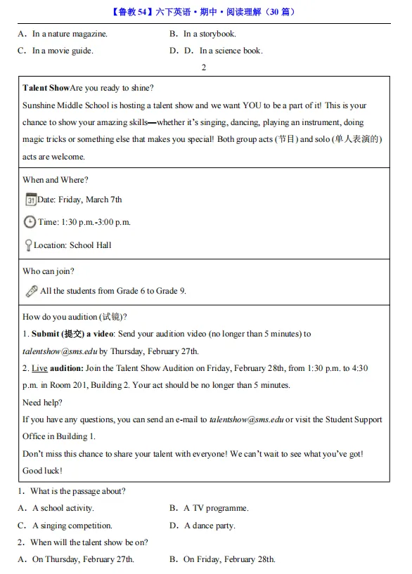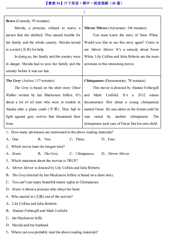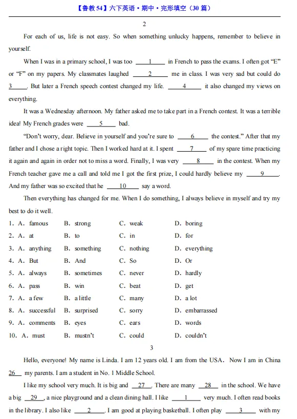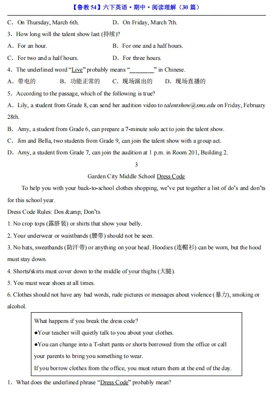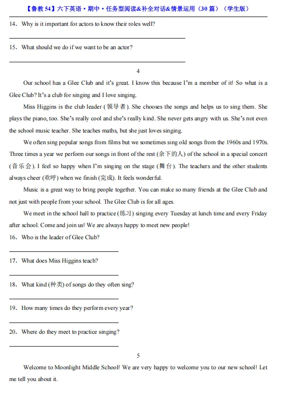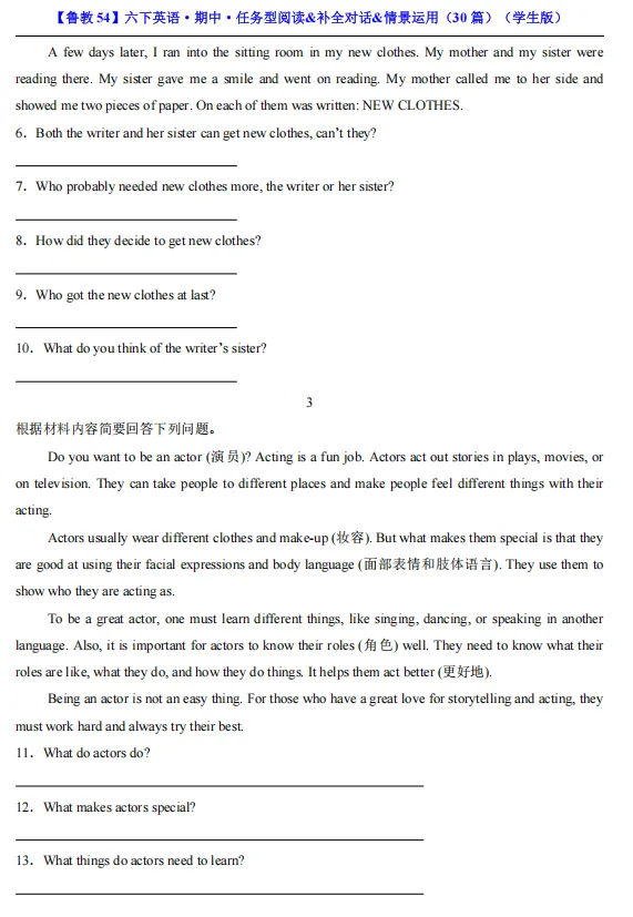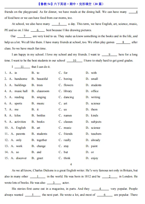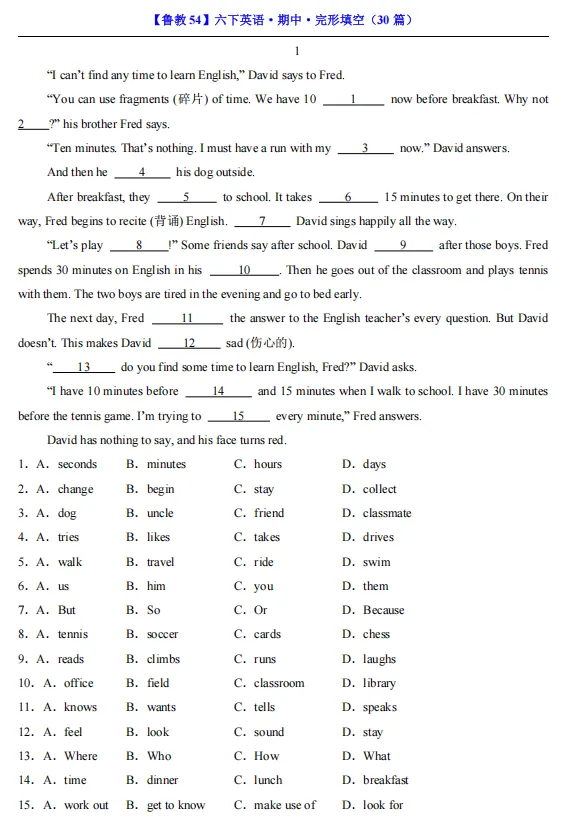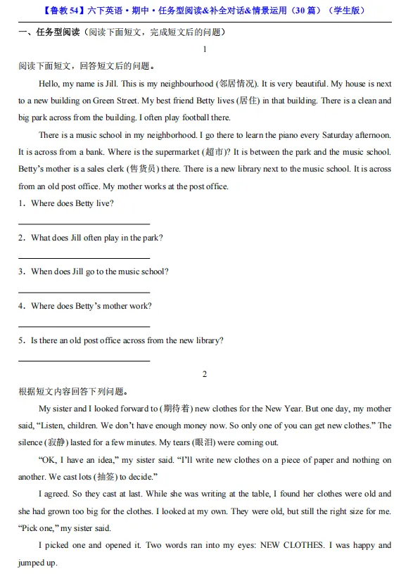 【期中资料】六年级下册鲁教54版英语期中资料汇总(含重点词汇、短语、句式归纳+各类型阅读材料+完形填空),pdf可下载