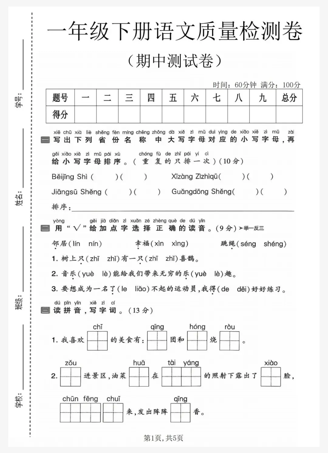 26春一年级下册人教部编版语文《期中真题测试卷》共5套(附答案)高清可打印
