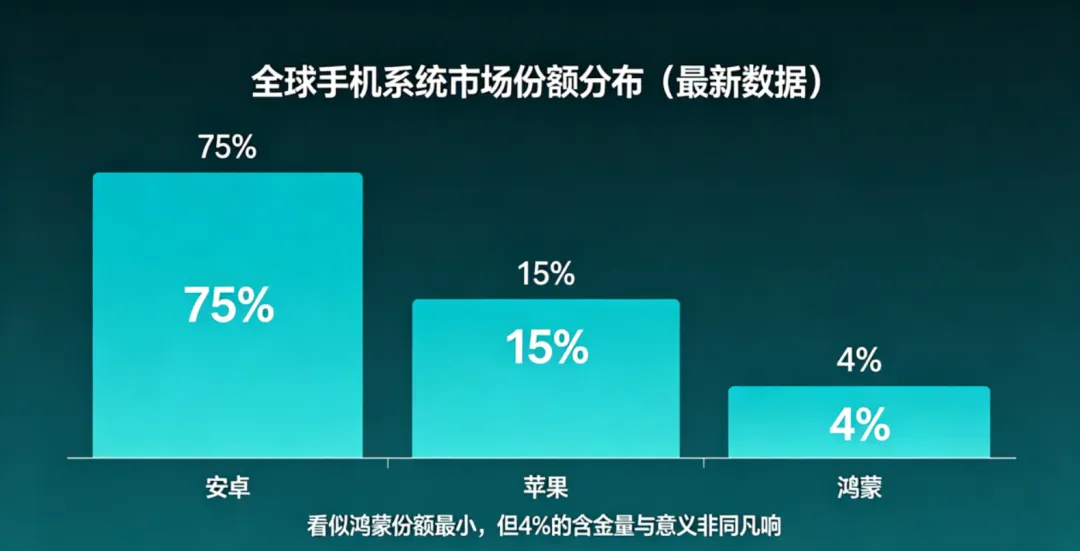如今全球手机系统已形成安卓、苹果、鸿蒙三足鼎立的格局。最新数据显示,安卓占据全球 79% 的市场份额,苹果 17%,鸿蒙 4%。看似鸿蒙份额最小,但这 4% 的含金量与意义却非同凡响。