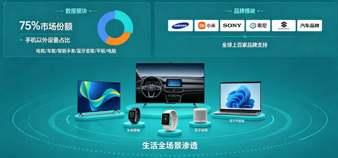 安卓的 79% 份额,绝非仅靠手机市场。从电视、车载设备,到智能手表、蓝牙音箱、平板、电脑,几乎所有能想到的智能设备,绝大多数都搭载安卓系统。全球上百家品牌,从国际巨头三星到国产头部小米,从索尼到汽车品牌,安卓的生态版图无处不在,早已渗透到生活的每一个角落,牢牢占据智能系统霸主地位。