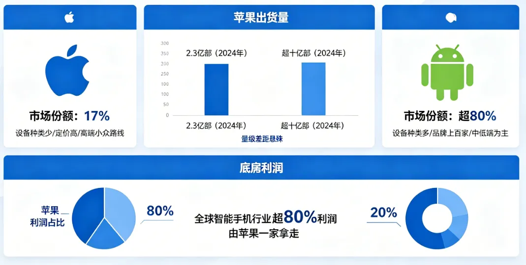 苹果 17% 的份额看似不高,但其玩法与安卓、鸿蒙截然不同。它是极度封闭的圈子,系统仅服务于自家设备,设备种类少且定价高,走高端小众路线。2024 年苹果全球手机出货量约 2.3 亿,而安卓阵营超十亿部,两者量级差距悬殊。