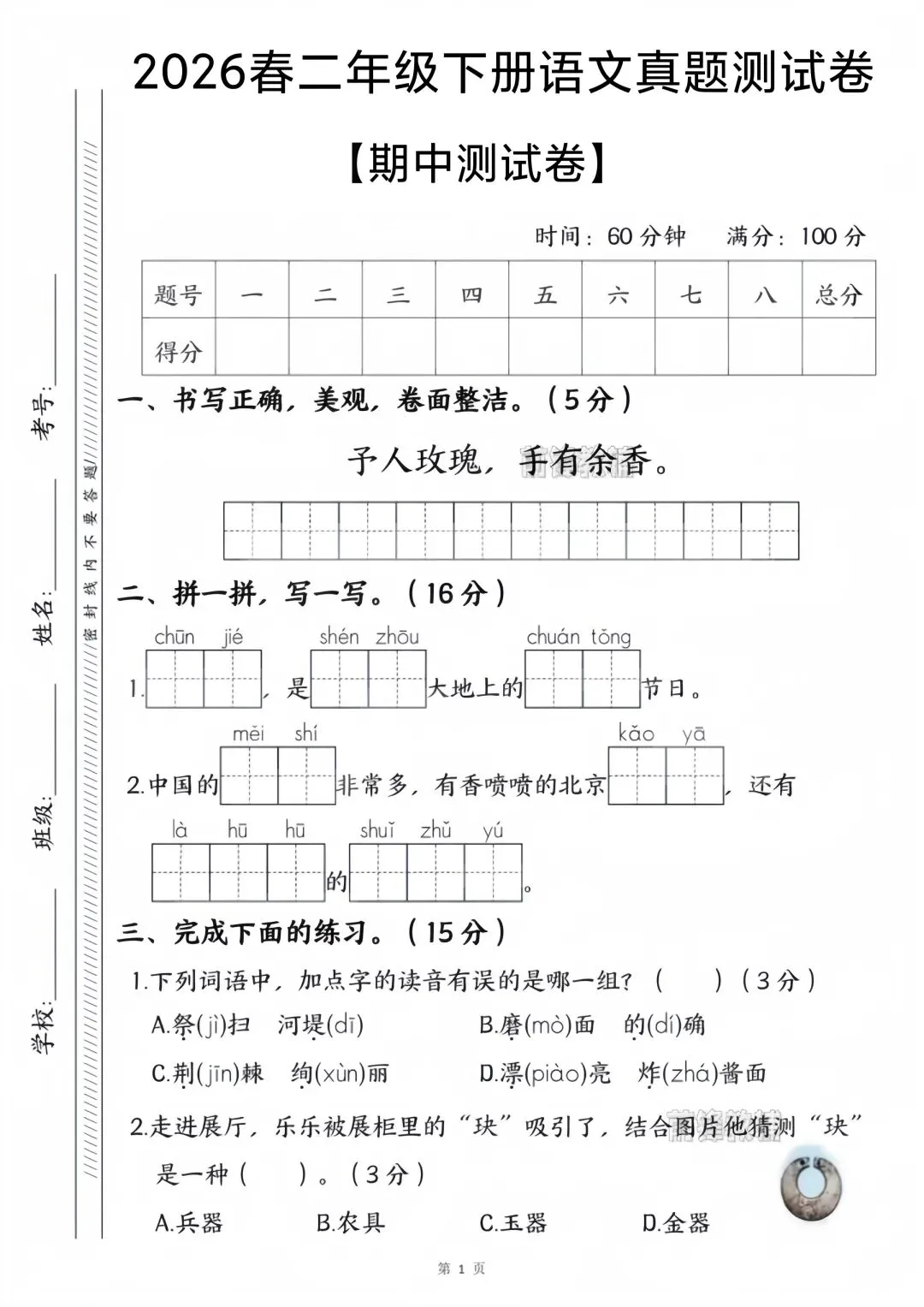 大家好,我是滔妈,今天给大家分享资料是:2026春二年级下册语文期中测试卷,共5页,有空白电子版可下载打印(有答案)。