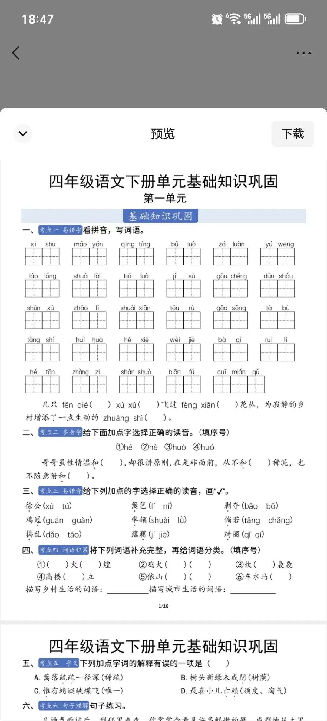 !②:在公众号对话框中回复:四年级语文第一单元基础巩固卷