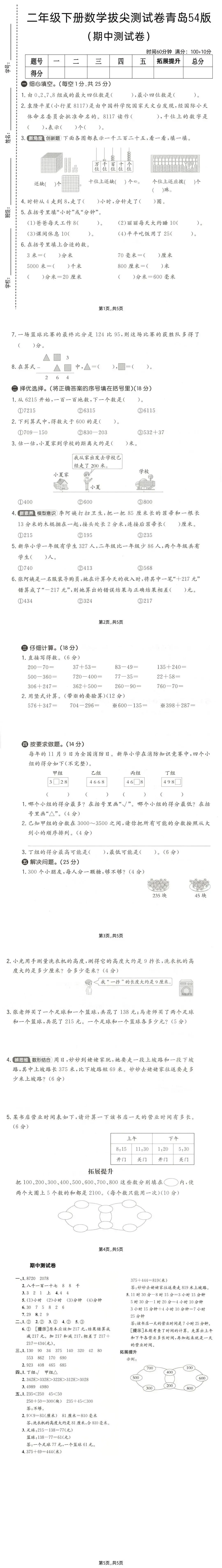 26春数学青岛54版一二三四年级下册《期中测试卷》多套 电子版可下载