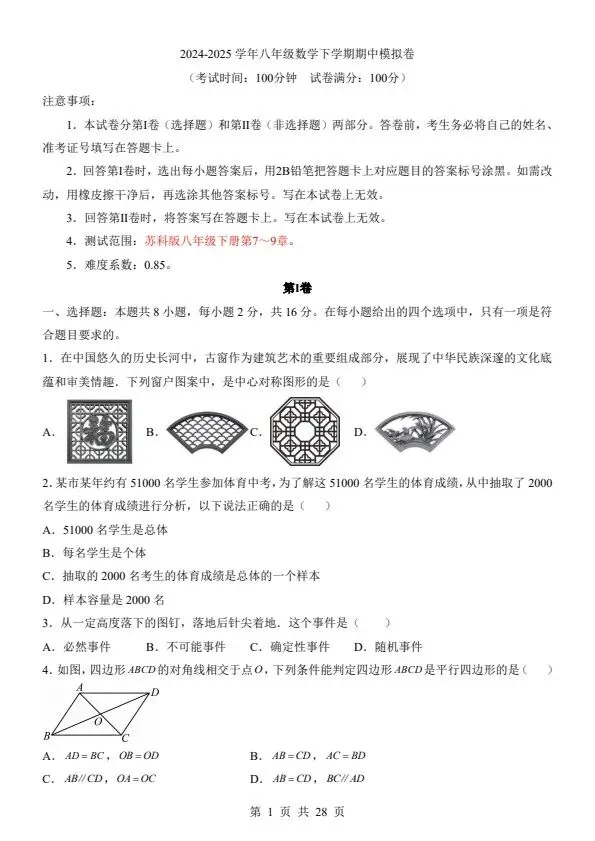 今日分享2026新八年级下册数学苏科版期中模拟卷(含解析+答题卡)完整电子版可打印!所有资料均为高清电子版,排版规整适配打印,不用费心整理,直接打印就能用。精准击破学习难点,帮孩子夯实基础、吃透考点,稳步提升学习效率!
