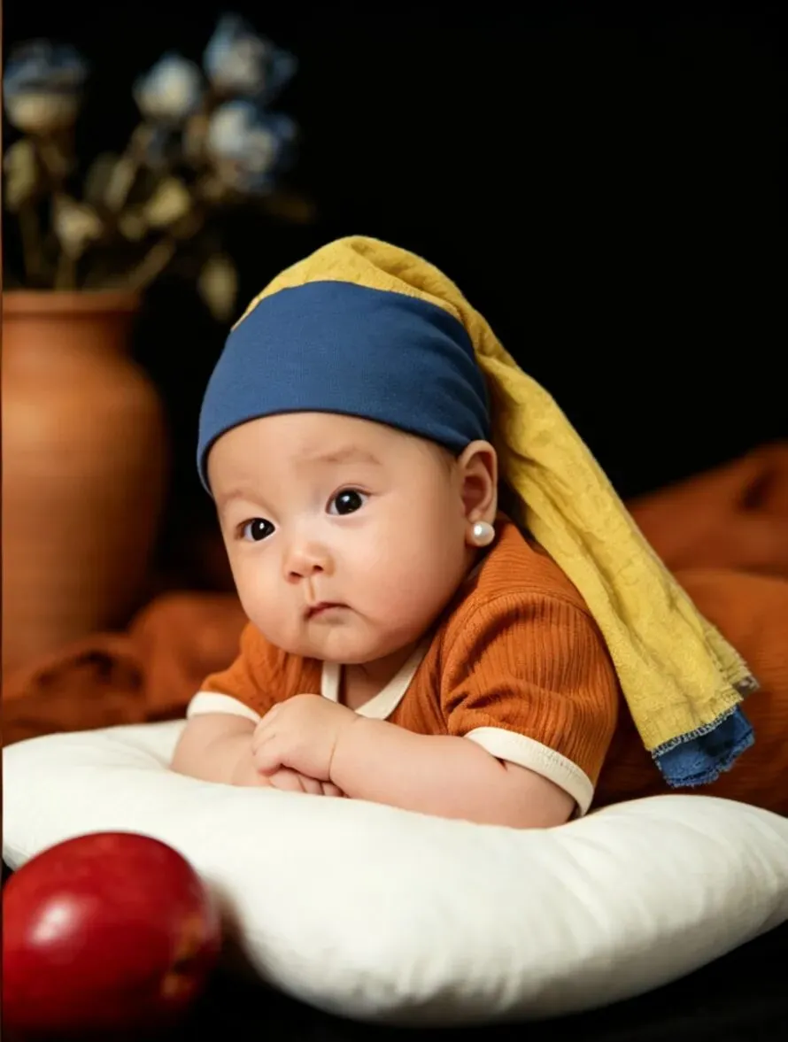 以前给小宝拍照,十张里九张是糊的。现在我直接扔进AI工具,说“把背景调亮,去掉红眼,做成卡通风格”,几秒钟就出来一组影楼质感的照片。上次我把做好的九宫格发家族群,婆婆还以为我花了好几百去拍的。(下图就是我用ai生成的带珍珠耳钉的宝宝)