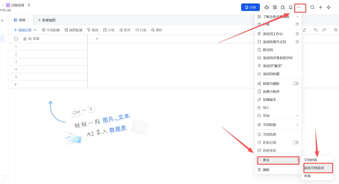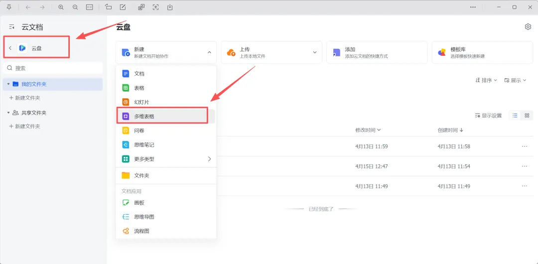 在飞书云盘中新建一个飞书多维表格。