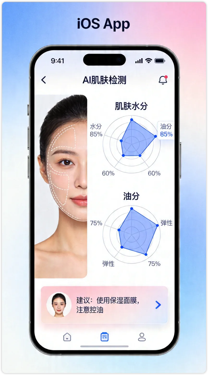 • 通过手机摄像头扫描面部,实时检测水分、油分、弹性、敏感度等多项指标 -