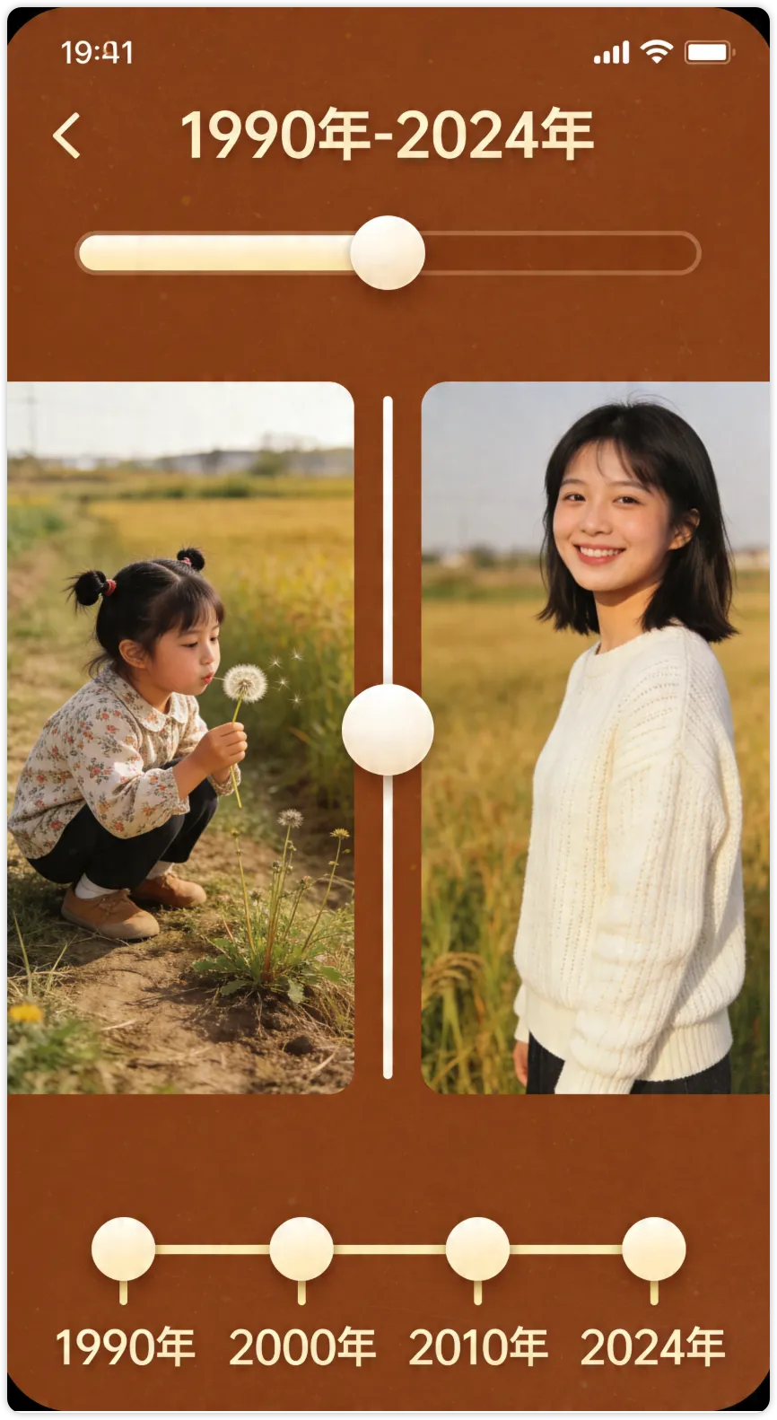 • 用户上传当前照片,AI自动生成童年/少年/青年等不同年龄段的面貌对比 -