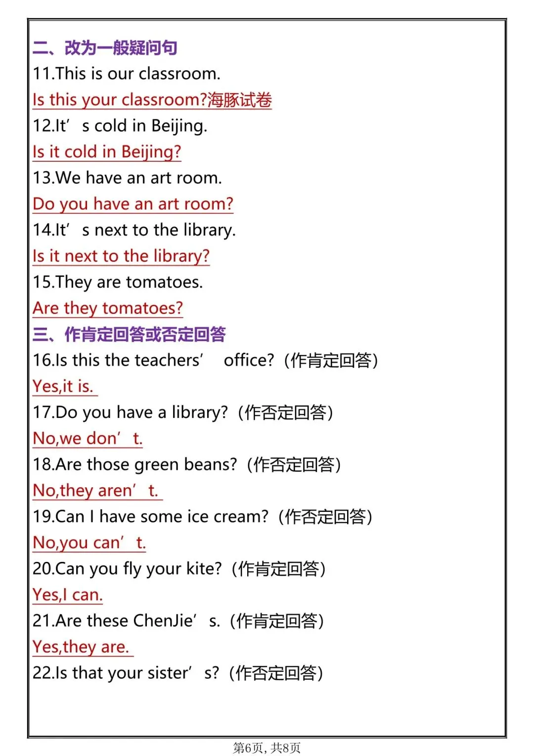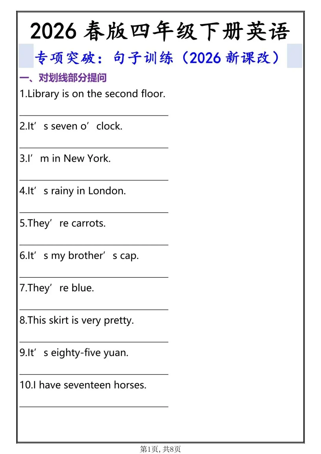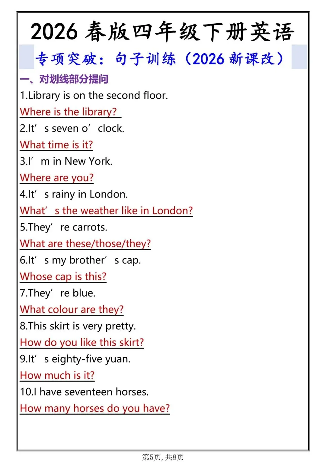 资料题型全面、难度贴合考试、排版清晰、可直接打印练习,配套完整答案,适合期中专项突破、课堂练习、家庭作业、考前巩固,帮助学生熟练掌握本册重点句型,稳拿英语句子题分数。
