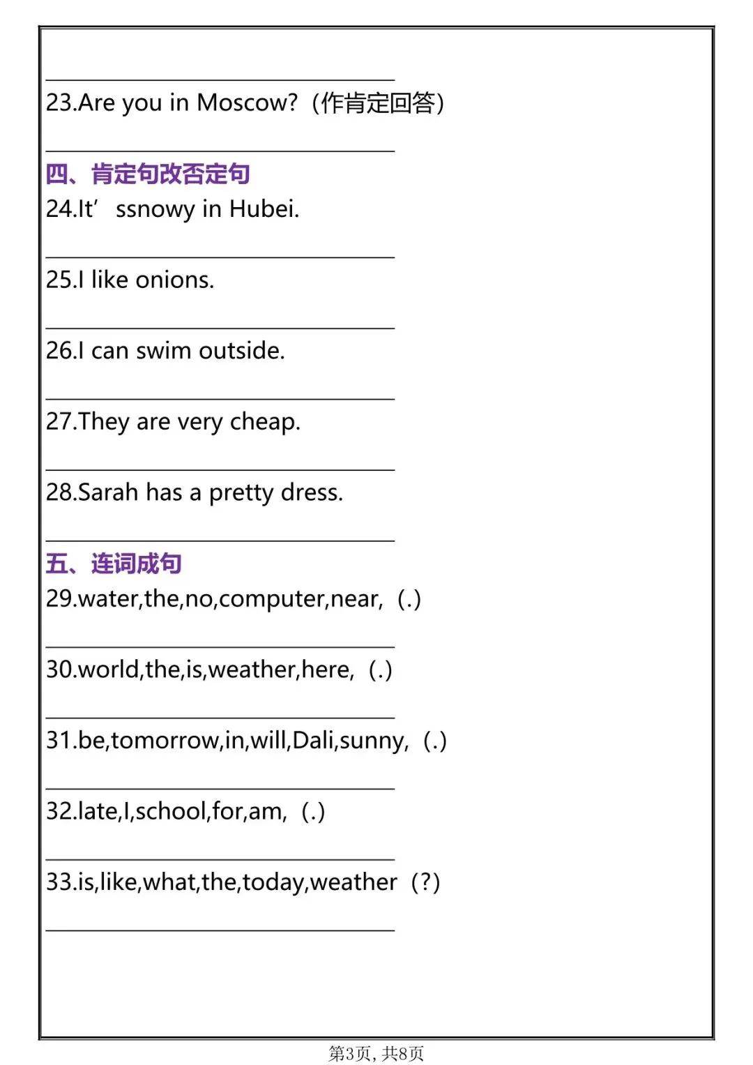 内容涵盖连词成句、情景选择、补全对话、按要求写句子、英汉互译、句子判断、句型转换等期中常考题型,同步课本重点句式,突出易错点与高频考点,重点训练学生句型记忆、规范书写与情景运用能力。