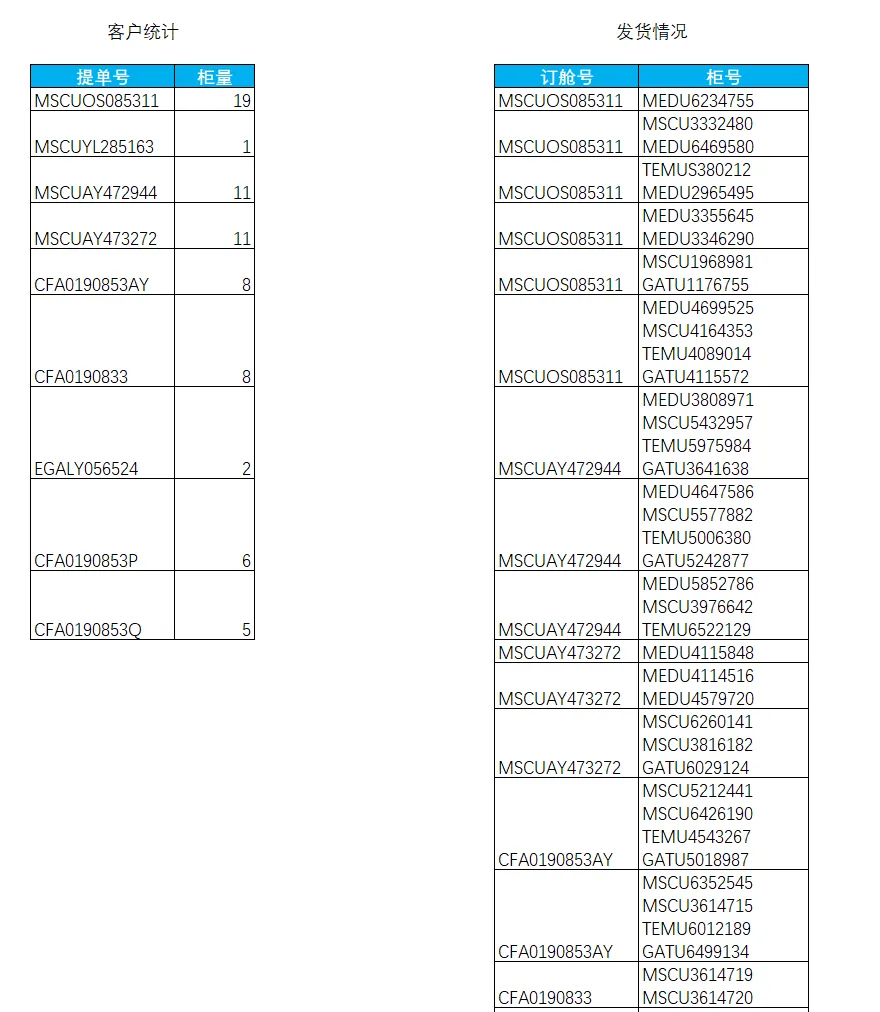 案例如下:见以下2张表格。左表是根据提单号汇总的出柜量;右表是根据订舱号统计出来的柜号,很多柜号是换行显示在一个单元格里的。提单号和订舱号是对应关系。现在要判断,右表每一个订舱号对应的柜量是否跟左表统计出来的提单号对应的柜量一致。