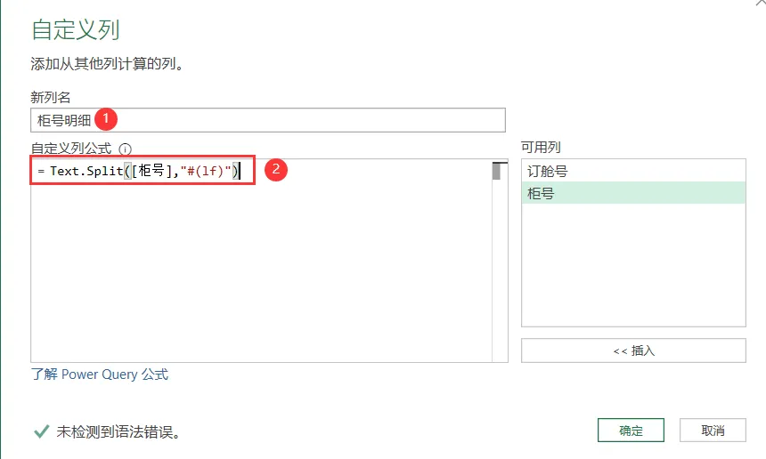 1)把发货情况这张表, 导入到查询编辑器里,然后插入自定义列,新列名命名为柜号明细,公式里输入Text.Split([柜号],”#(lf)”),见如下操作。这里就用到了#(lf)。使用#(lf)这个换行符把柜号单元格里的柜号分别拆分成单独行。