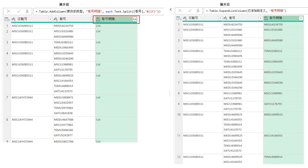 2)拆分结果如下图。左边是展开柜号明细之前的效果。右边是展开柜号明细之后的效果。这样就实现了一个单元格显示一个柜号。这样发货情况这张表的操作就完成了。关闭并上载。