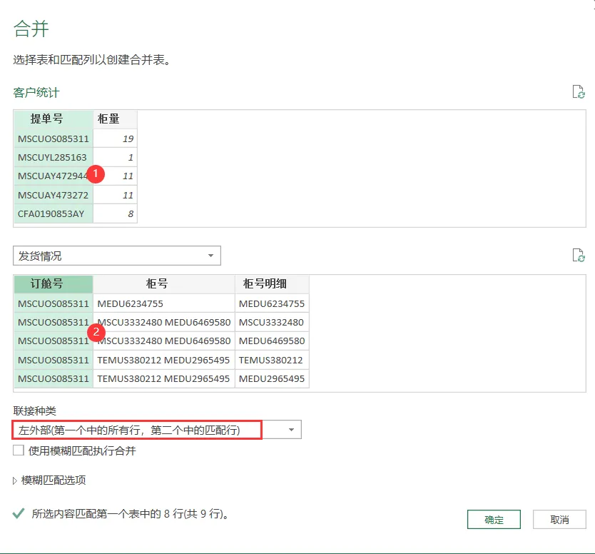 3)选择客户统计这张表加入查询编辑器,然后选择合并查询,操作如下图所示。让提单号和订舱号进行匹配,联接种类选择左外部。