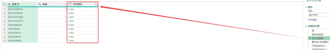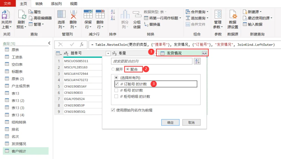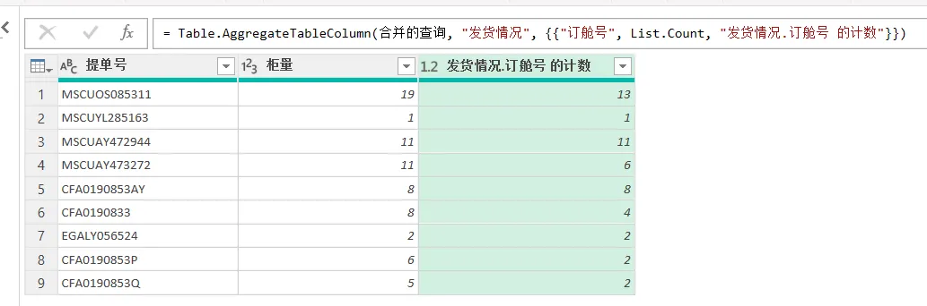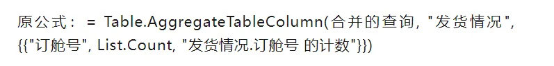 原公式:= Table.AggregateTableColumn(合并的查询, “发货情况”, {{“订舱号”, List.Count, “发货情况.订舱号 的计数”}})