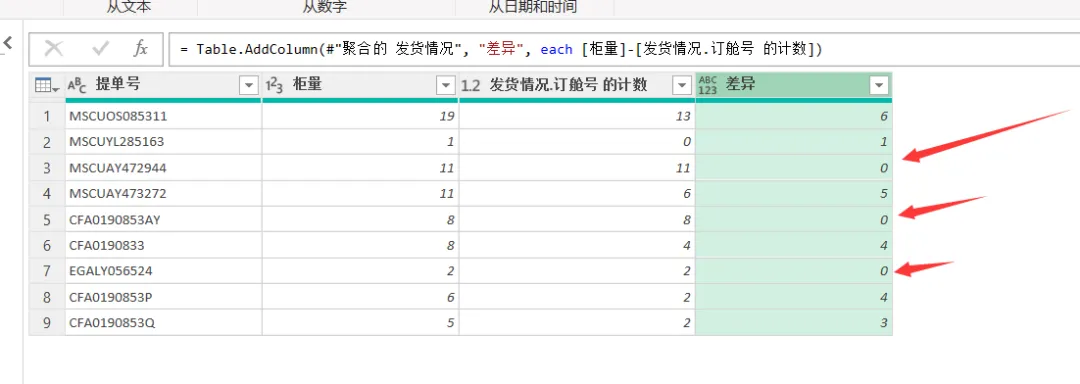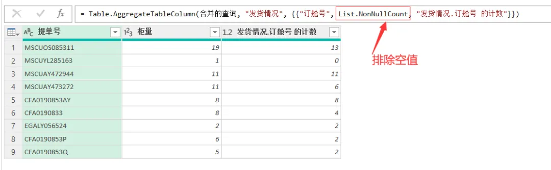 修改后的公式:= Table.AggregateTableColumn(合并的查询, “发货情况”, {{“订舱号”, List.NonNullCount, “发货情况.订舱号 的计数”}})