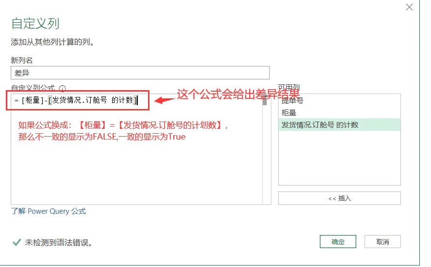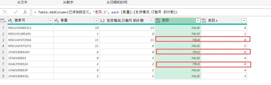 7)添加自定义列,判断发货情况统计的柜量跟客户统计里的柜量是否一致。操作如下图所示。