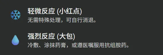 :免疫系统对蚊子唾液过度反应,产生大量组胺,导致 巨大、瘙痒难耐 的包。 - 脱敏效应