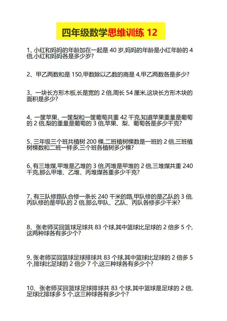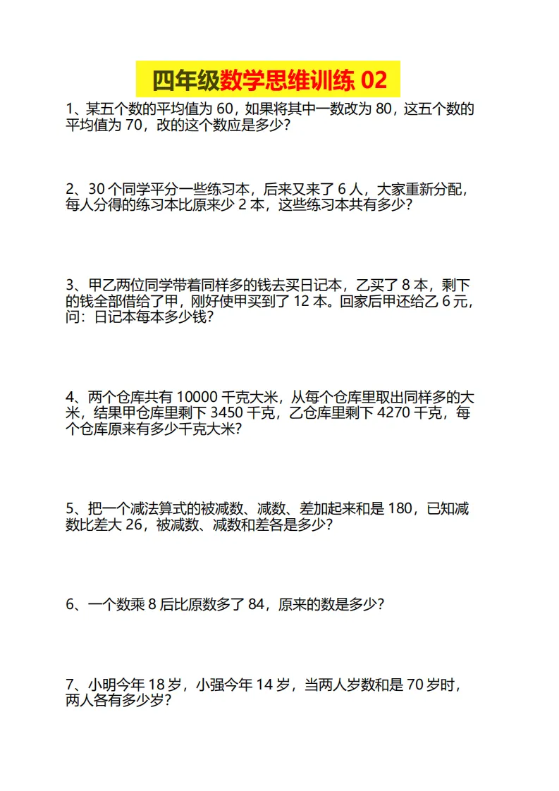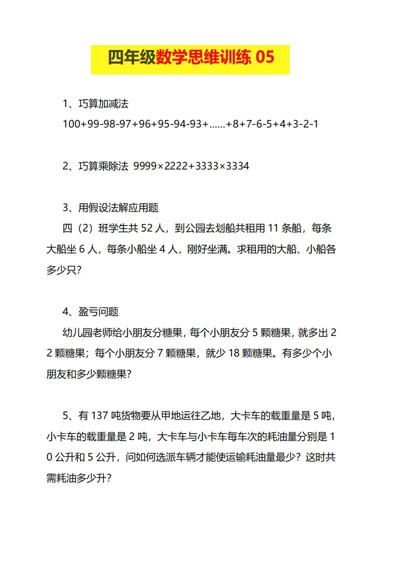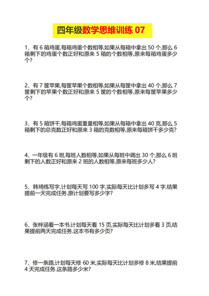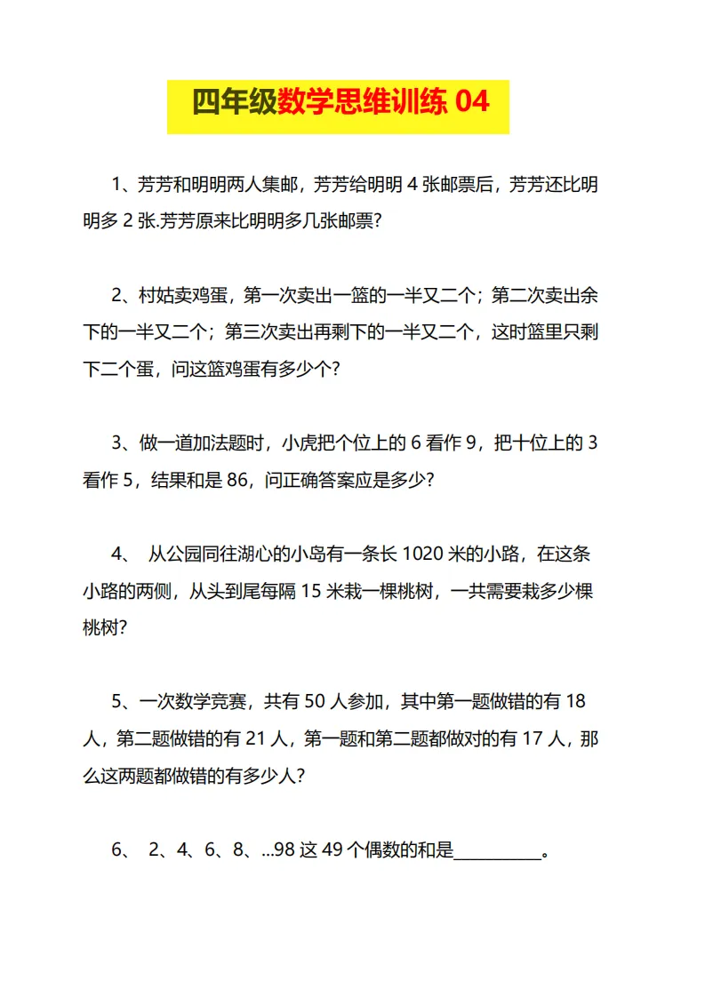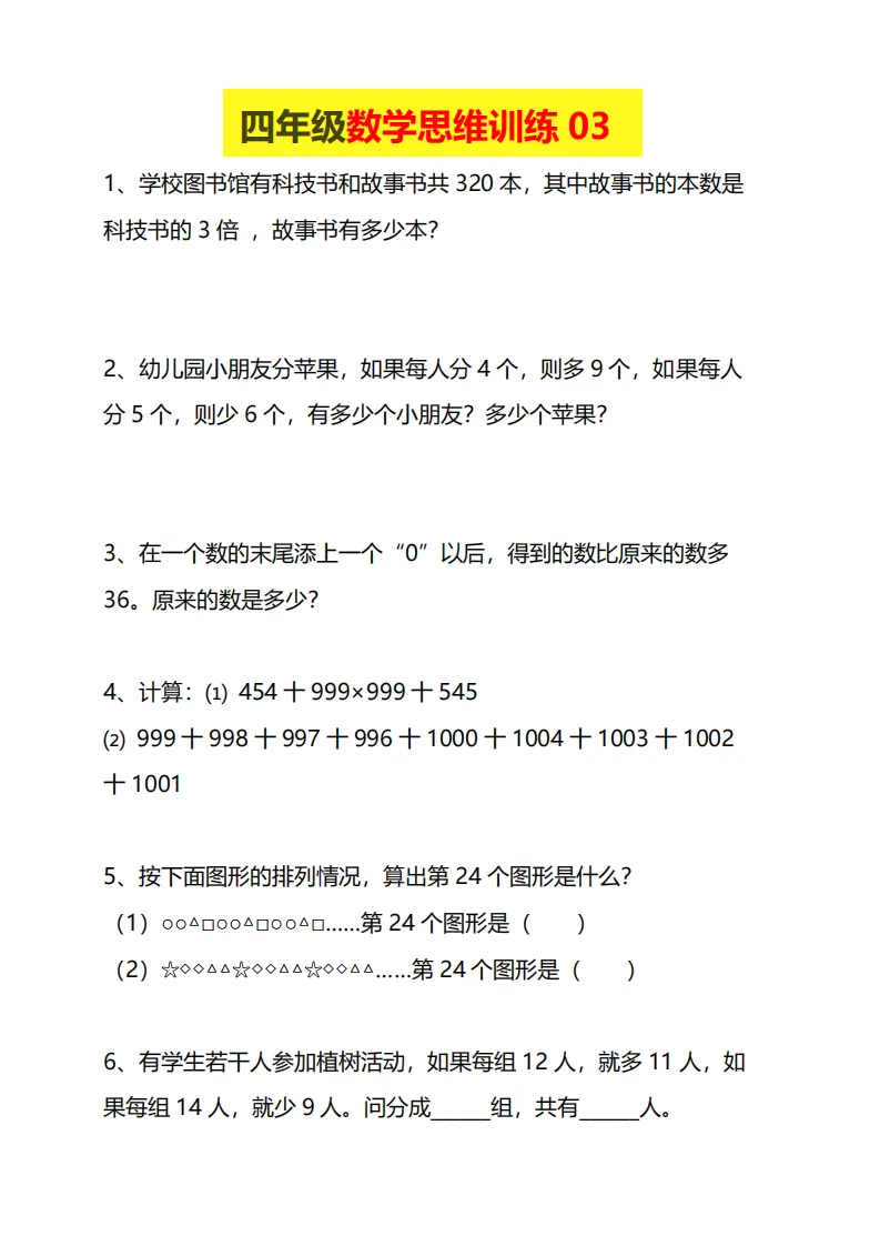 🌸今天给家长分享的是:26四年级下册数学《思维训练题|电子版可打印