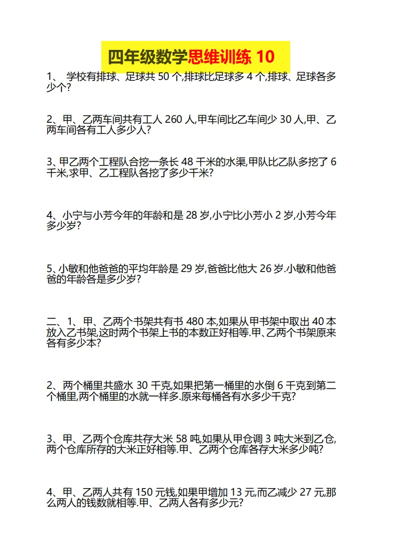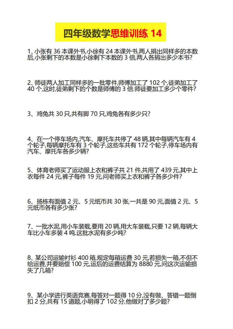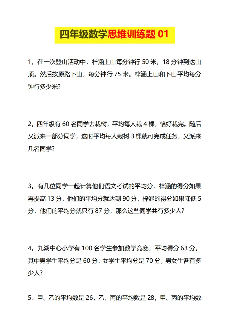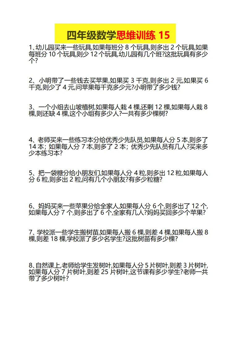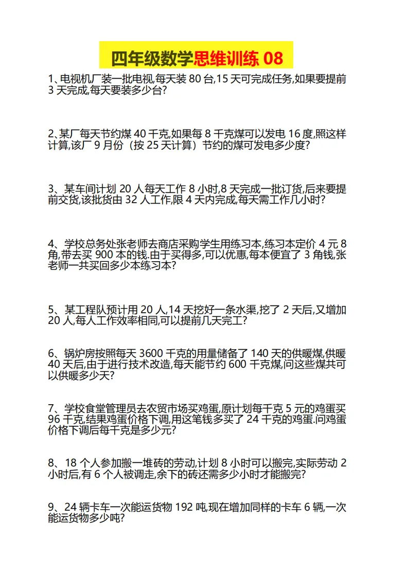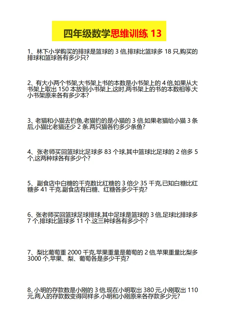 🌸今天给家长分享的是:26四年级下册数学《思维训练题|电子版可打印