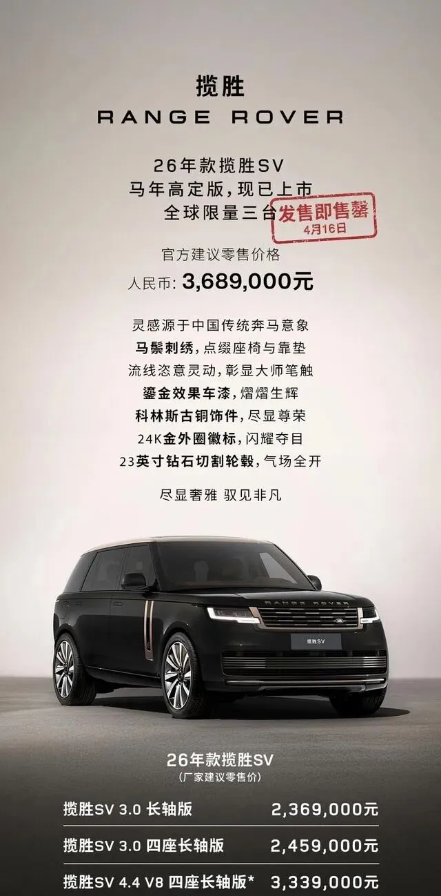 更有意思的是,揽胜一边说着“你们随便模仿”,一边转头就甩出了个狠货——揽胜SV马年高定版。这车一亮相,全场估计都倒吸一口凉气。不是因为它有多花哨,而是因为这玩意儿太稀缺了。全球就三台,少到什么程度?估计很多国家连一台都分不到。而且价格也相当“不讲道理”,官方建议零售价直接干到了368.9万元。