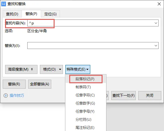 将鼠标放在「查找内容栏」中,单击「特殊格式」按钮,选择「段落标记」,「替换为」中不输入任何内容,单击确定,就可以批量删除文档中的回车符。