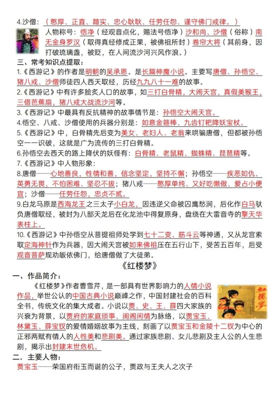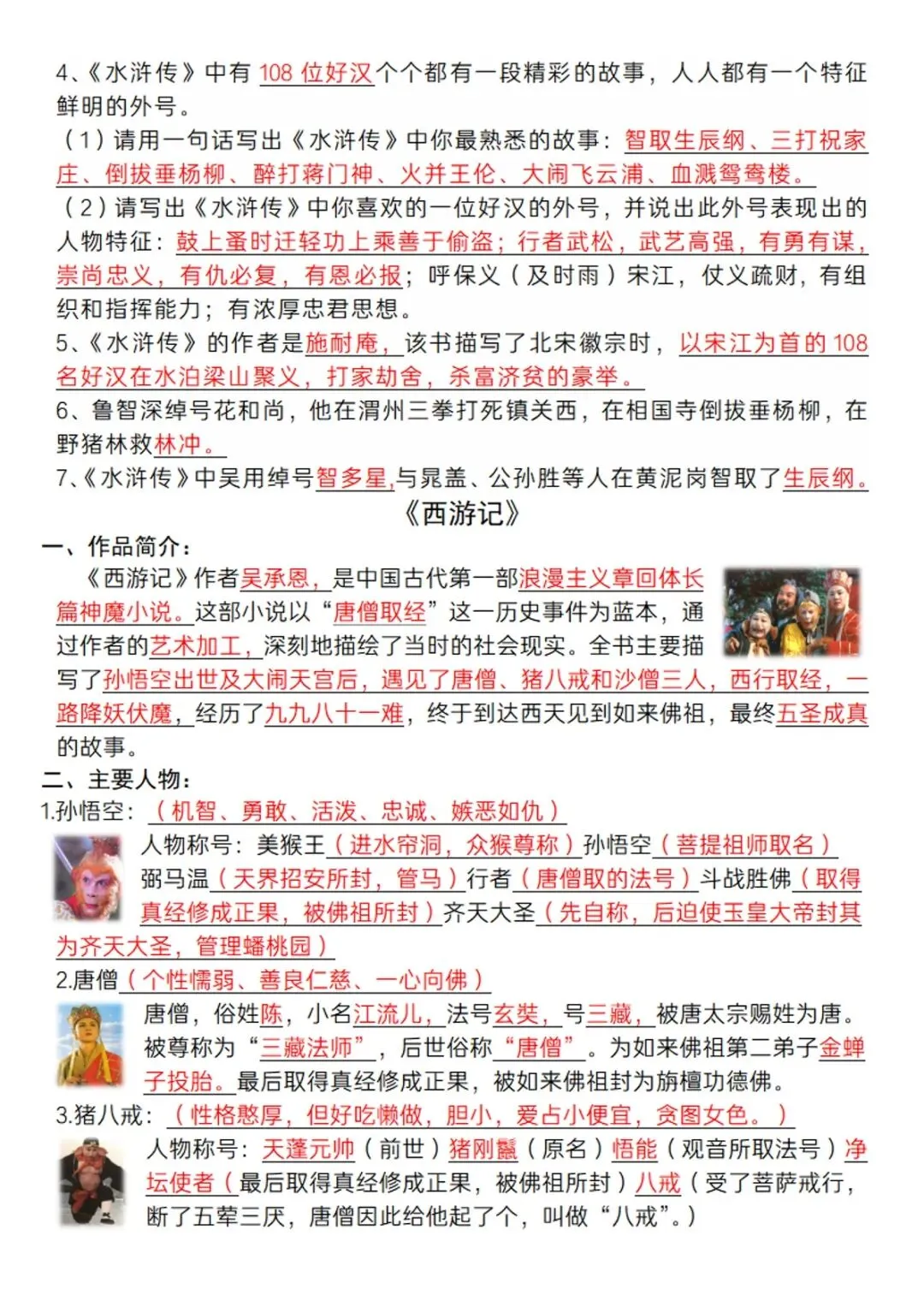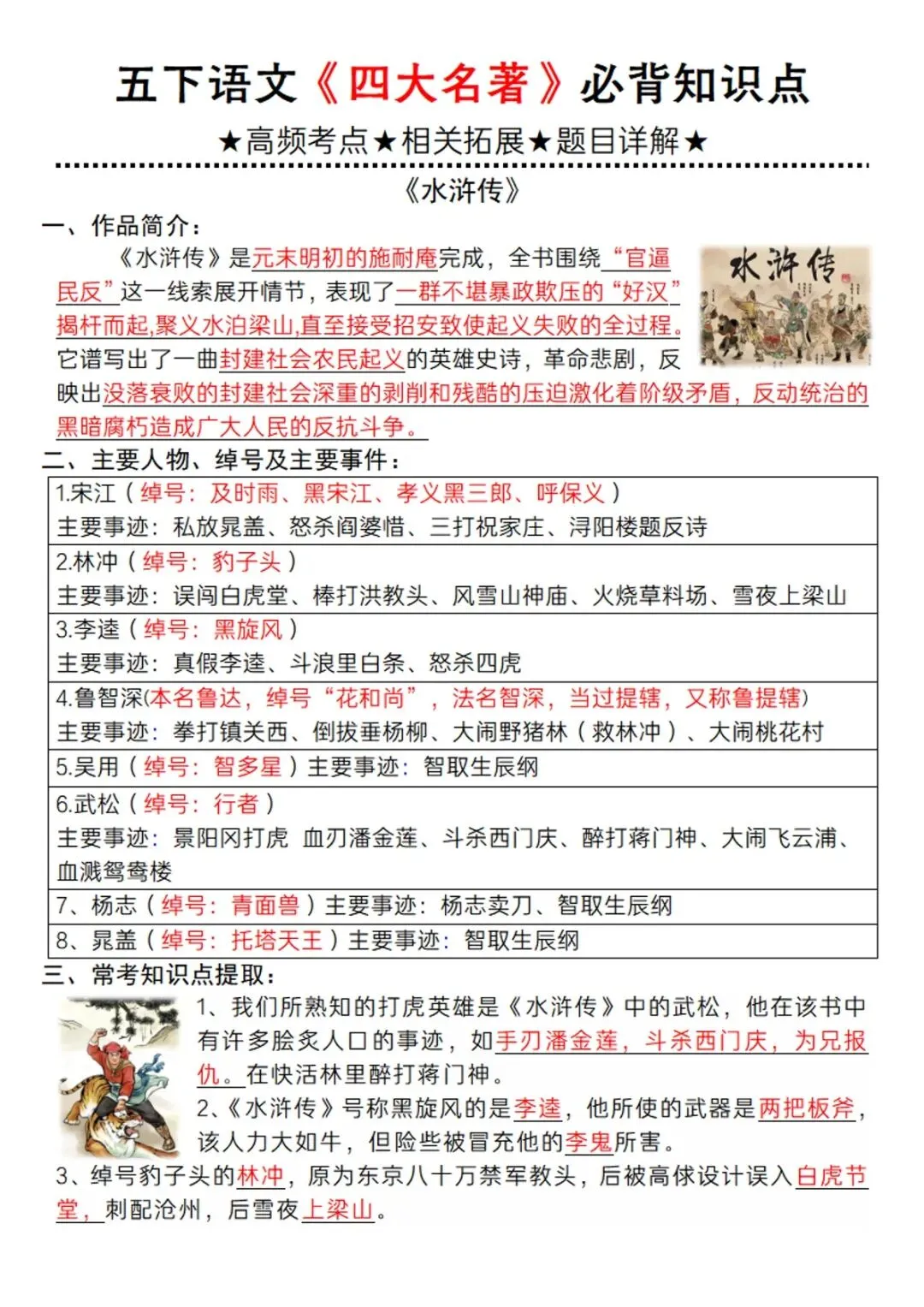 五年级下语文《四大名著》必背知识点 电子版可打印