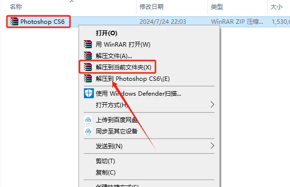 1.打开下载的Ps软件安装包,鼠标右击选择【解压到当前文件夹】。