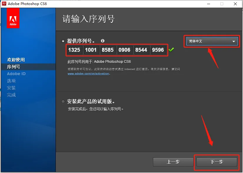 8.这里序列号输入:1325 1001 8585 0906 8544 9596,语言选择【简体中文】,然后点击【下一步】。
