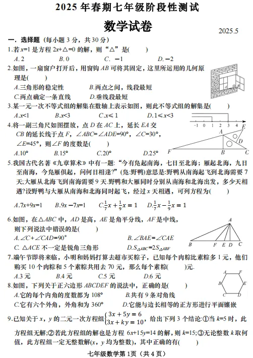 2025年春期七年级数学阶段性测试试卷+答案(word+PDF)