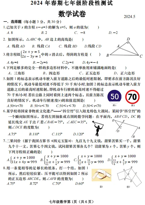 2024年春期七年级数学阶段性测试试卷+答案(word+PDF)