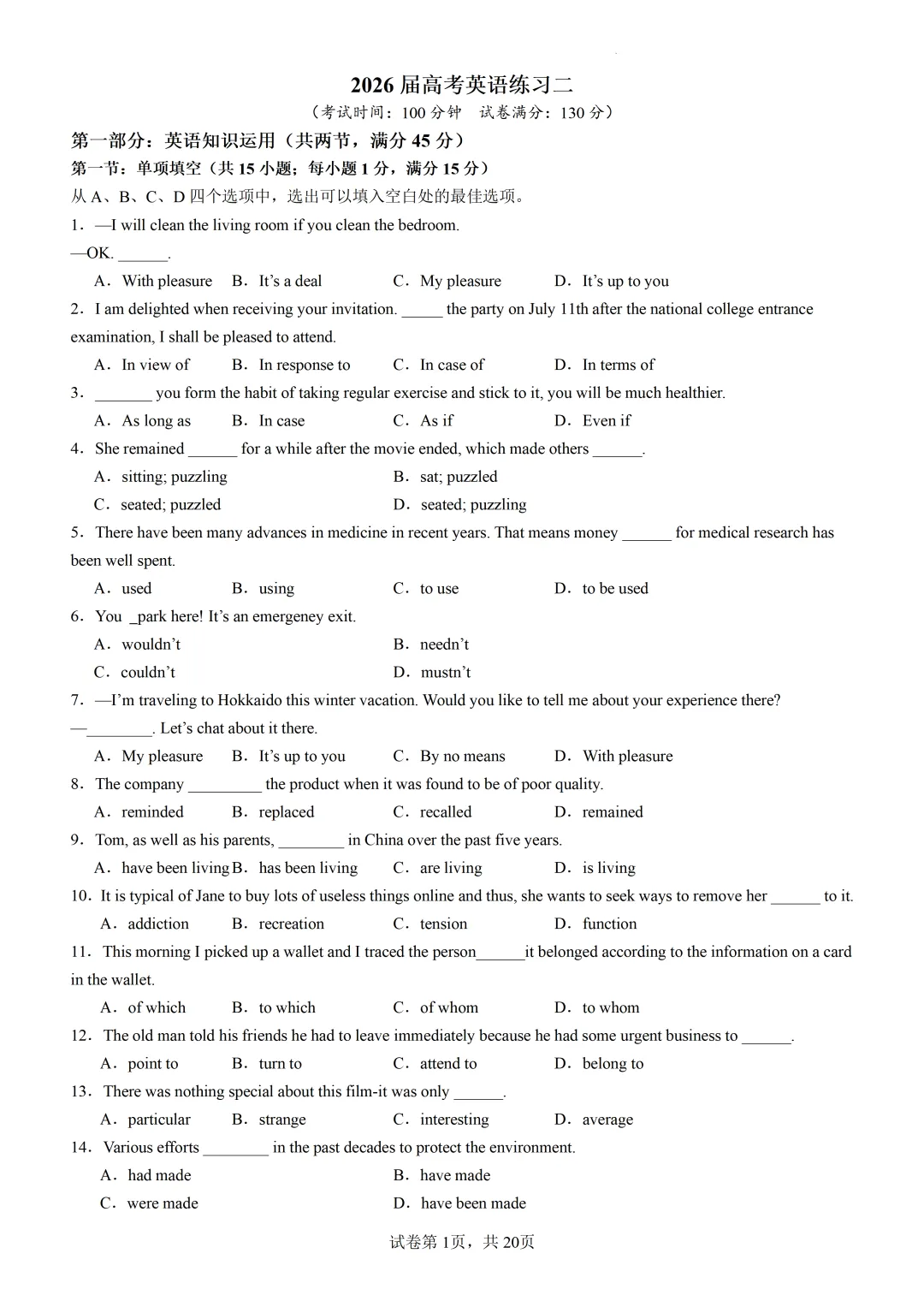 【可下载】2026高考英语二模模拟试题二(附解析) 点击上方“蓝字”免费关注! 本套试卷完整版+答案解析下载入口 关注“卿卿侃古今”公众号 点击左下角阅读原文可下载 相关链接: 2007-2025年天津市高考英语真题汇总(持续更新中~) 2011-2023年天津高考英语听力真题在线测试 【高考英语听力在线测试】高考听力机考模拟试题大全(持续更新中) 【可下载】2025-2026年高中英语试题汇总(附解析)【持续更新中】 【汇总】高中英语月考和期中期末试题(持续更新中~) 【题库】高一英语试题汇编(持续更新中~) 【题库】高二英语试题汇编(持续更新中~) 【题库】高三英语试题汇编(持续更新中~) 【可下载】高三英语上学期期末试题16套(附解析) 【可下载】高二英语上学期期末试题10套(附解析) 【可下载】高一英语上学期期末试题汇9套(附解析) 【可下载】2025-2026学年度高一高二高三开学考试模拟试卷(天津专用)(附解析) 新外研版高中英语高清电子课本、课文原文和译文、单元同步复习资料和试题【持续更新中】 【目录1】高中英语阅读理解限时训练大全(持续更新中~) 【目录2】高中英语完形填空限时训练大全(持续更新中~) 【目录3】高中英语书面表达大全(持续更新中~) 【目录4】高中英语听力训练大全(持续更新中~) 【目录5】高中英语单选题大全(持续更新中~) 【目录6】高中英语语法题大全(持续更新中~) 【目录7】高中英语阅读表达题大全(持续更新中~) 【目录8】科普知识汇总 【目录9】中高考学法知识汇总 【目录10】高考英语真题+名校模拟真题+月考和期中期末试题(持续更新中~) 【目录11】暑期高考英语备考资料大全持续更新中~【汇总】中高考志愿填报资料大全 【汇总】高中英语月考和期中期末试题(持续更新中~) 【汇总】2025届高三英语一模试题(附解析) 【汇总】2024届高三英语一模二模三模试题(附解析) 【汇总】2024届高考英语押题卷(附解析) 【汇总】2025届高三英语周考综合练(附解析) 【题库】高三英语限时训练(持续更新中~) 【模拟】2025届高三英语听力机考模拟试题在线测试 【高考词汇】(新)外研版高中英语全七册词汇表(附音频) 【中考词汇】初中英语外研版必备单词表(完整版),可打印 建议收藏保存 点击阅读原文查更多
