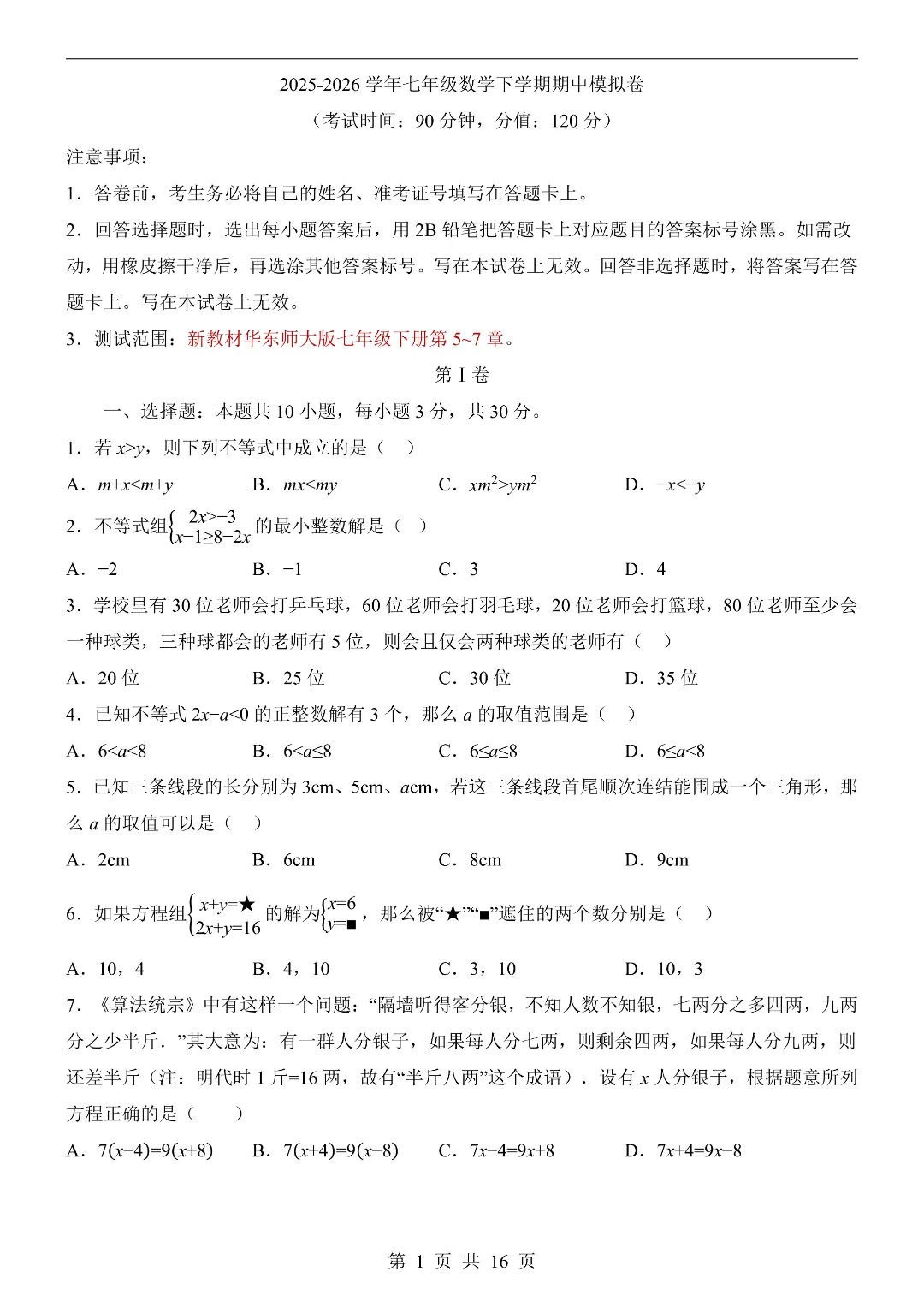 今日给家长朋友们分享的是:26年春新七年级下册初一华东师大版数学《期中考试押题测试卷》含答案解析‖电子版可打印