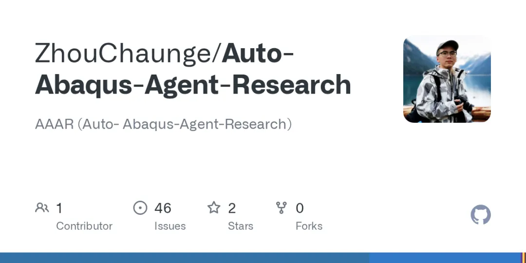 ZhouChaunge 的 AAAR 项目让 AI Agent 直接操作 Abaqus 有限元仿真软件,目标是自动化工程研究流程。