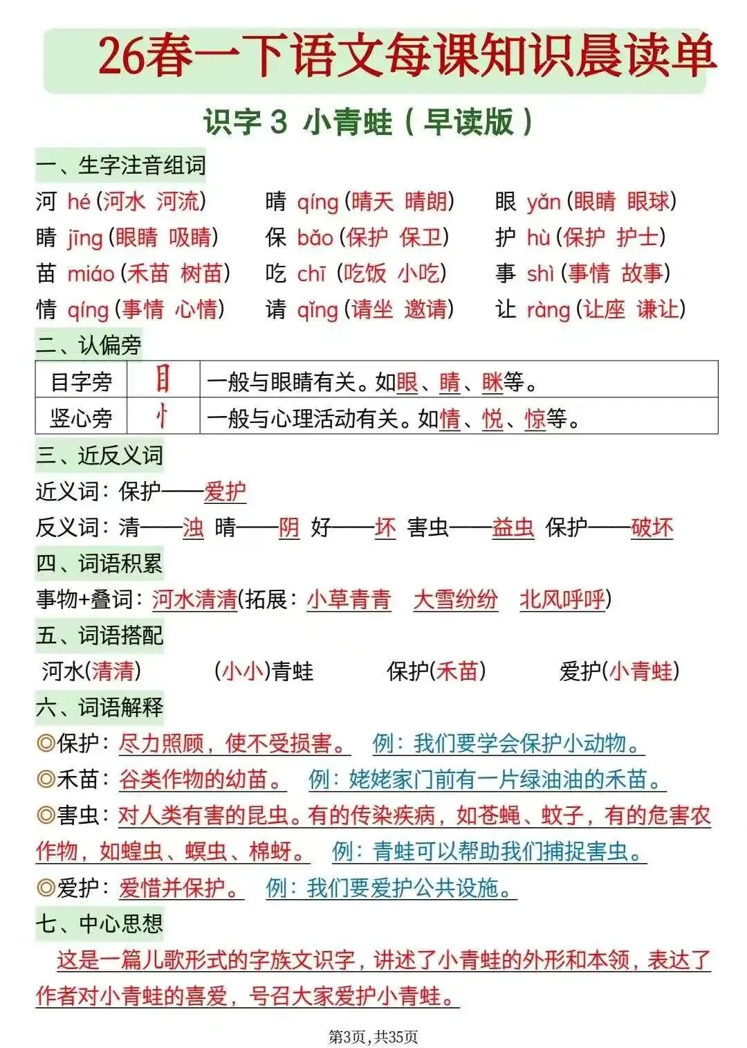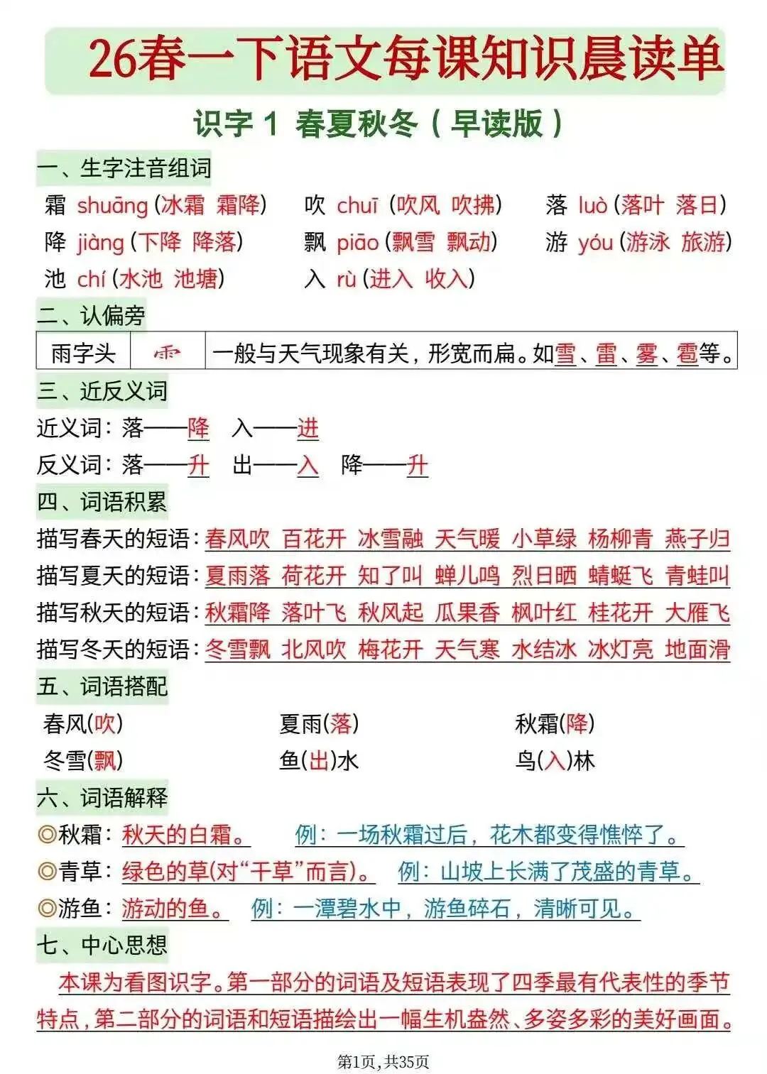 今日分享2026年春《一年级下册语文每课知识晨读单》电子版可打印,孩子坚持每日晨读知识点,能轻松巩固课内基础知识。