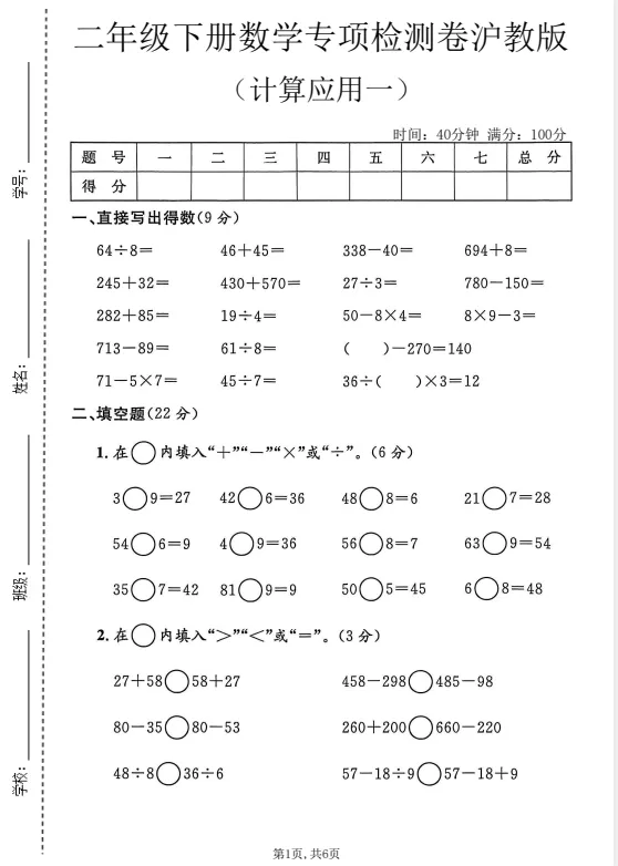 今天给大家准备好了!~二年级(下)数学 计算应用专项检测卷1《沪教版》pdf丨可下载打印