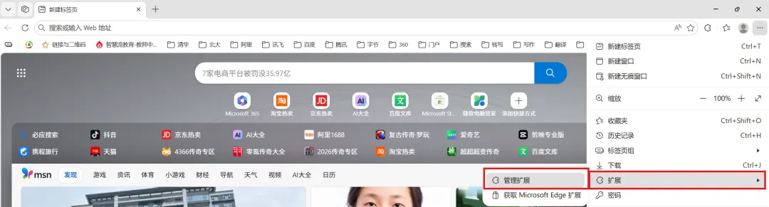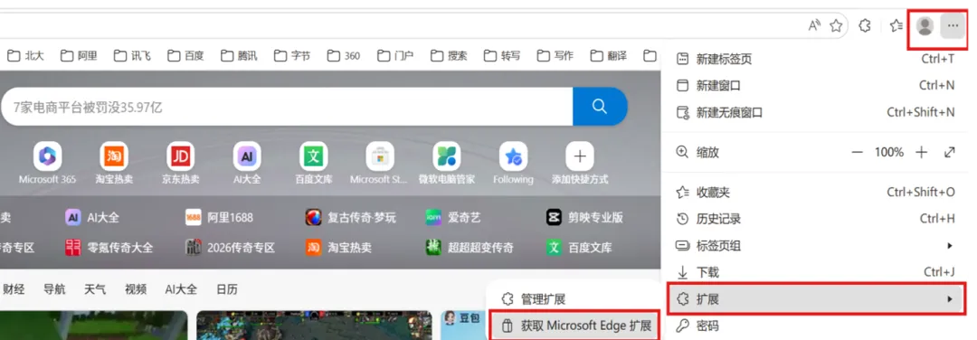 打开edge浏览器,点击右上角的三个点,找到扩展,获取拓展。