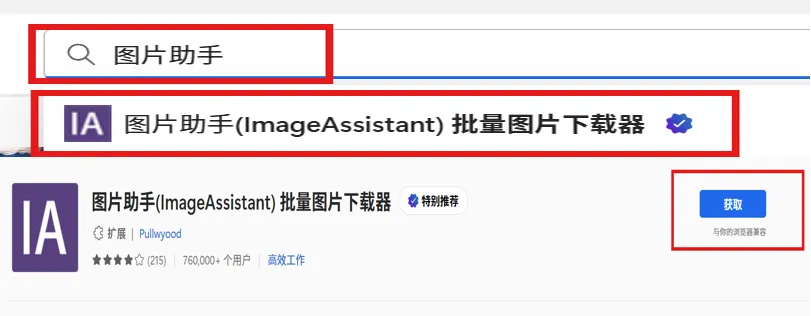 在搜索框输入”图片助手“,点击获取。如果这一步成功了,就可以直接使用,如果不成功的话,我们进入方法二。