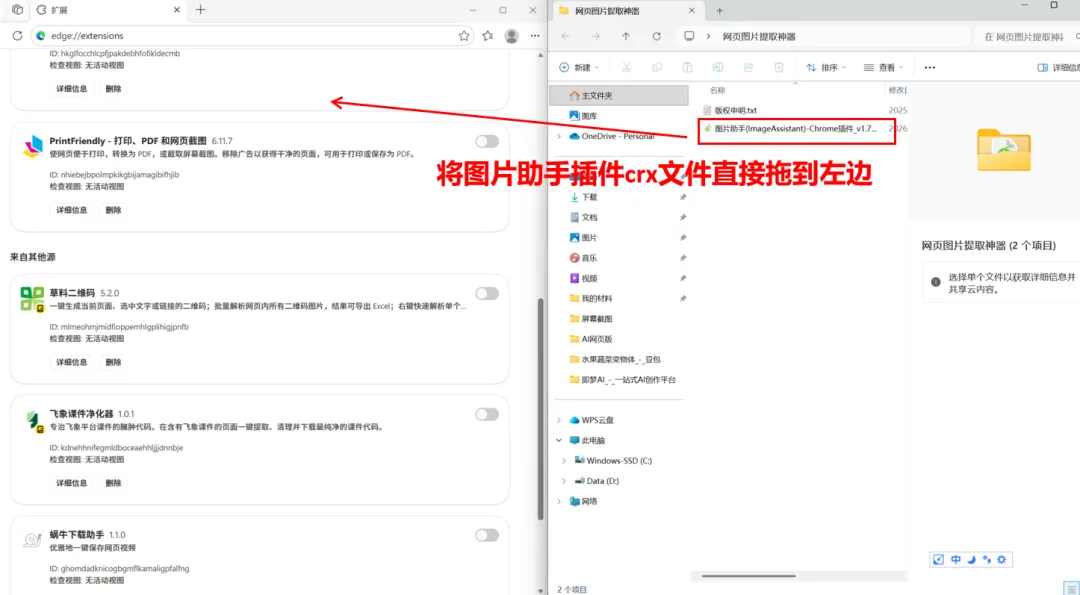 准备好图片助手插件,将插件的CRX文件直接拖动到管理扩展页面